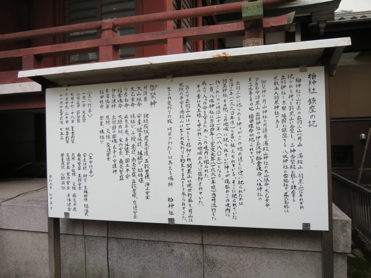 柏神社は1660年頃に、山形の出羽神社と京都の八坂神社を合祀し創建されたと伝わります。ご祭神として大山津見命(おおやまつみのみこと)、素戔鳴命(すさのおのみこと)を祀っています。