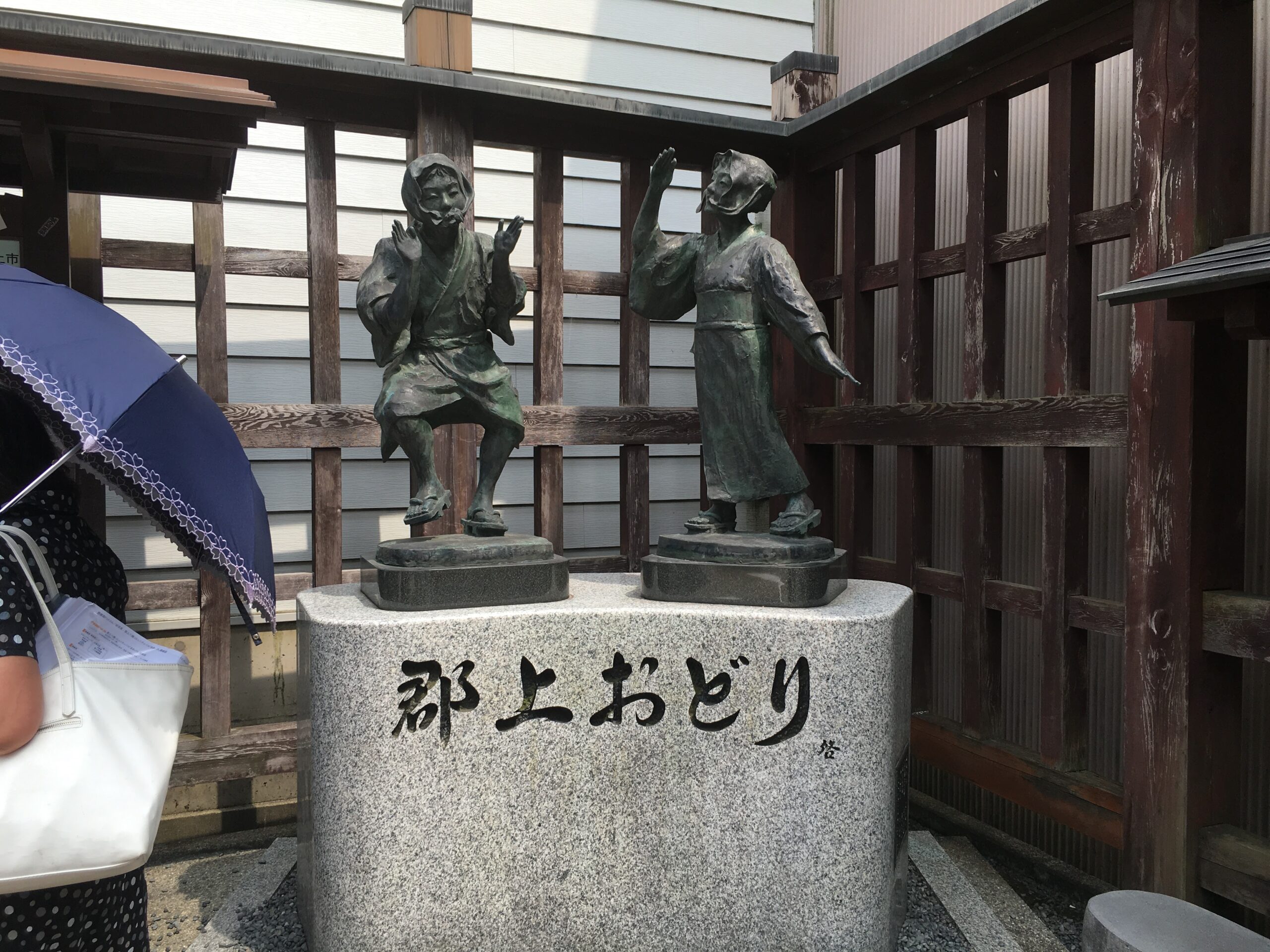 郡上おどりの開催地でもある郡上市八幡町に立つ銅像にも、ほっかむりをして踊る男女の姿が再現されている。