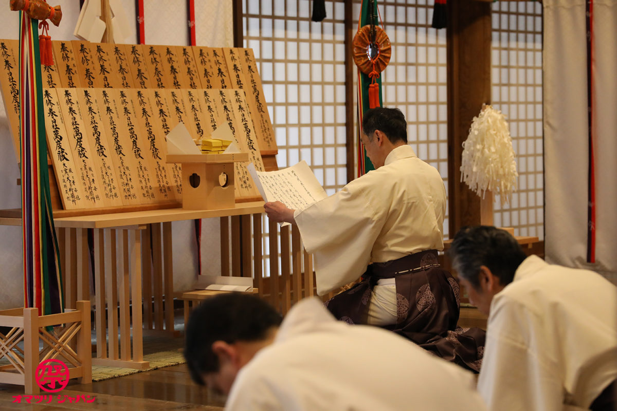 お祓いと祝詞奏上ののち、大祓詞(おおはらえのことば)を三度、参拝者とともに唱えます。