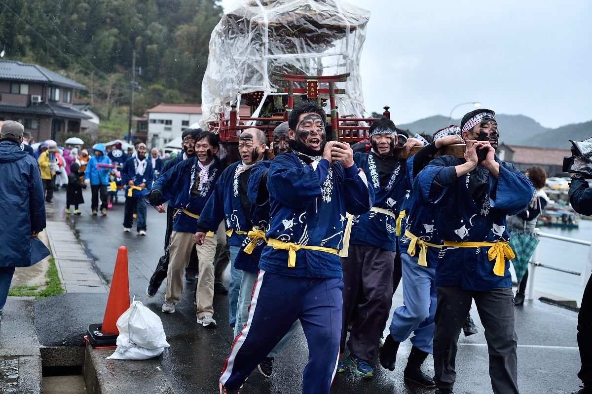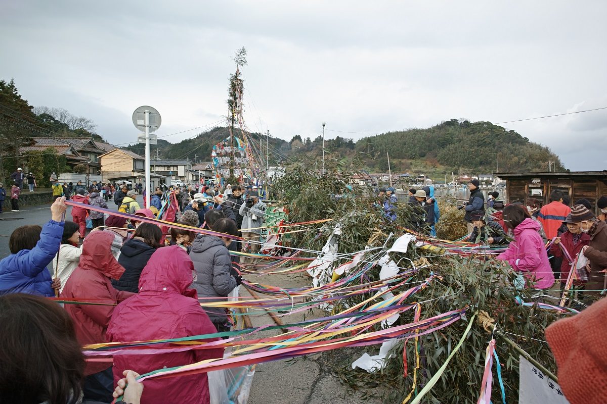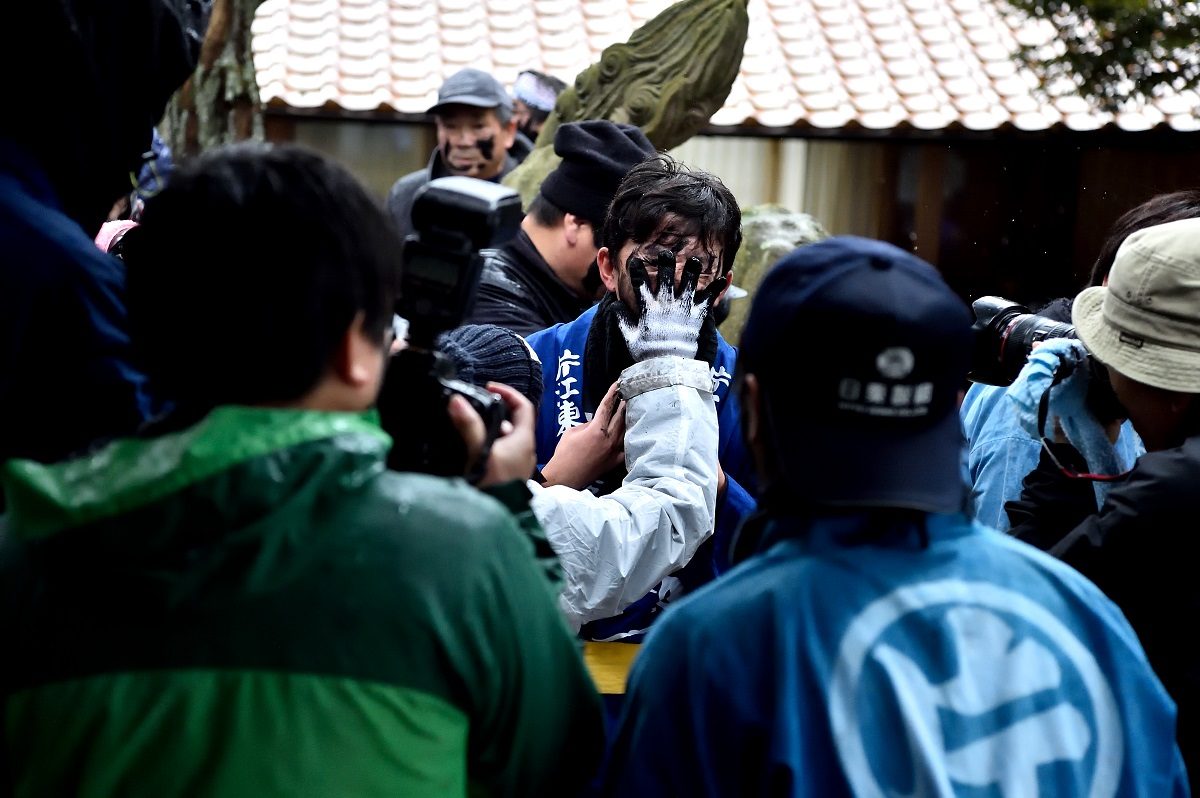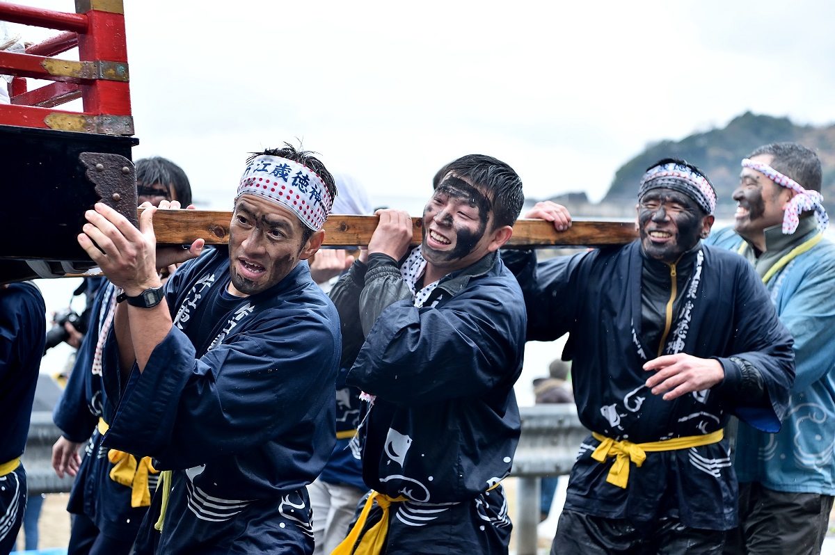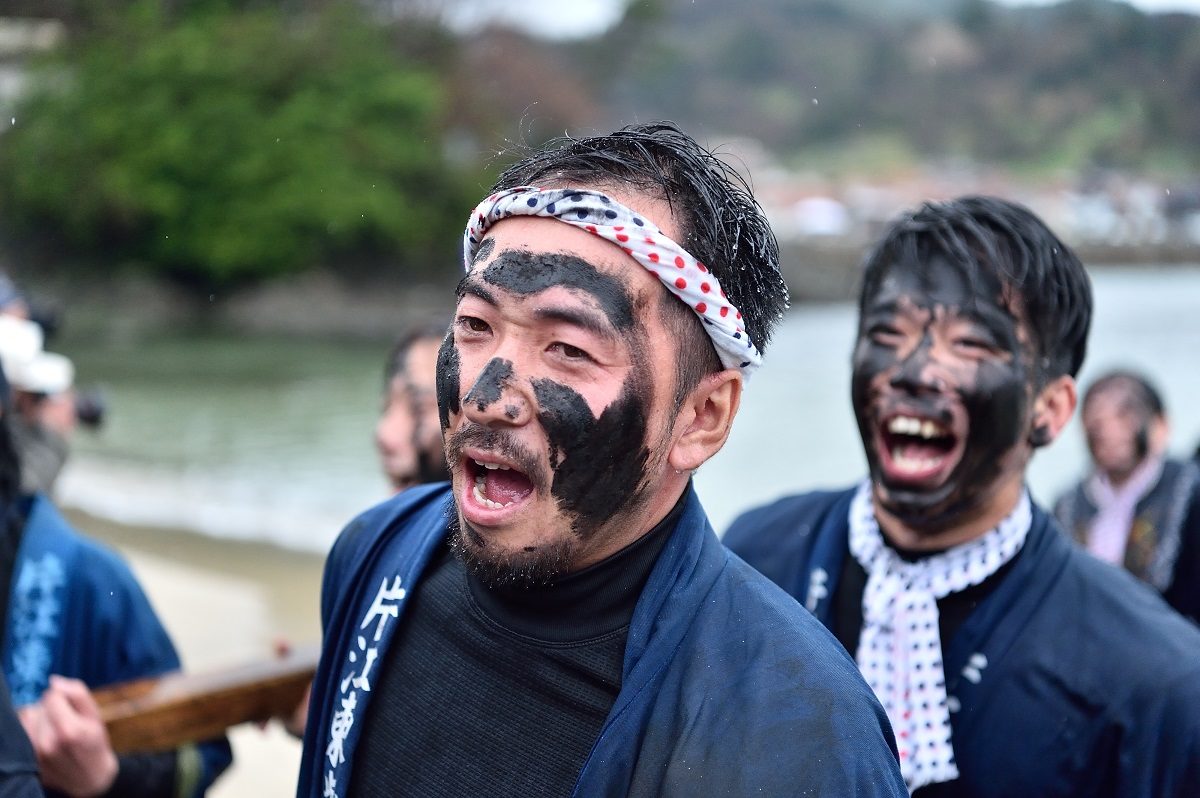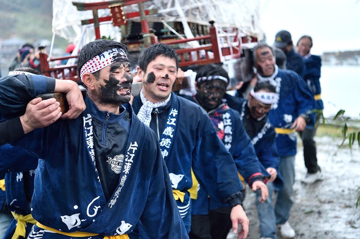 島根県松江市美保関町片江地区周辺に伝わる伝統行事。大根などに墨を含ませ、誰かれ構わず塗りつける。墨をつけられると1年間健康に過ごせるという250年近く続く伝統行事です。祭りの中心は、方結(かたえ)神社から担ぎ出された歳徳神の神輿と華やかな2本の竹で作られたトンドです。