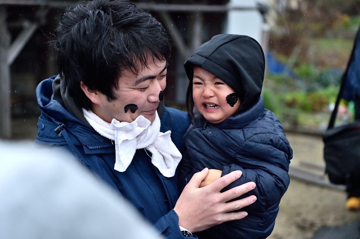 優しくぐりぐりです。トンドさんのまわりに集まった人たちはたちまち墨で真黒になるのですが、墨をつけられるとその1年間は風邪をひかず、みんな黒くなってるので、全然気になりません。