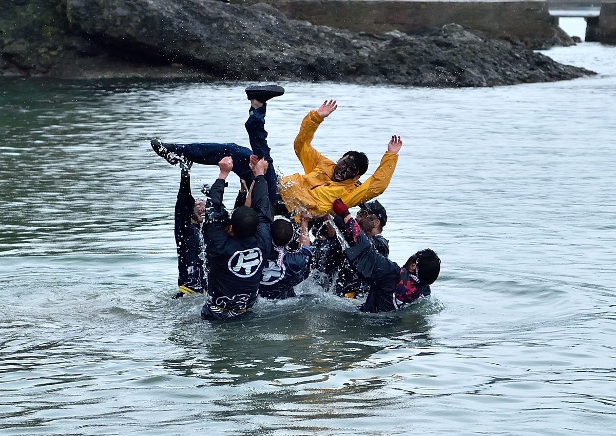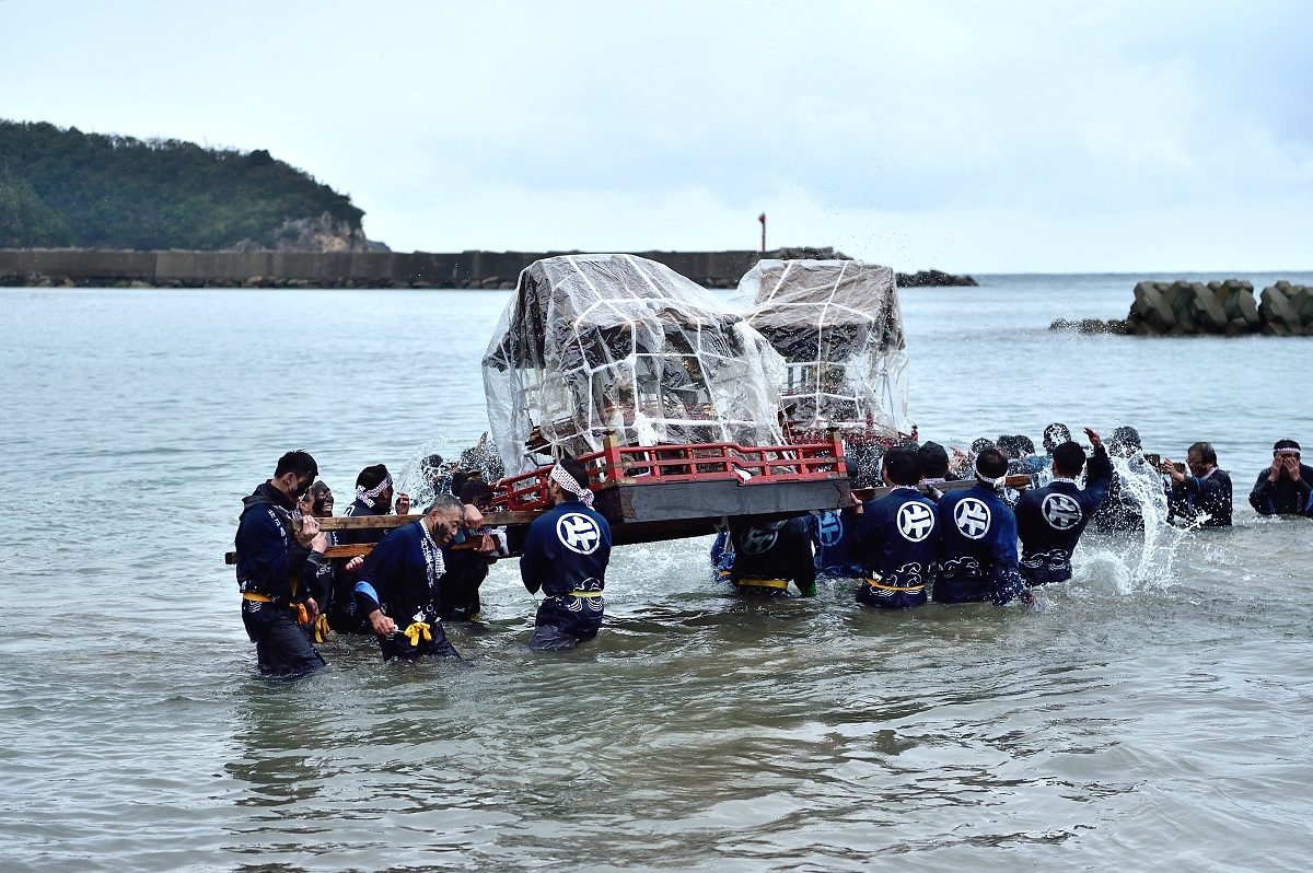 地域巡りの終盤は神輿が海へ入っていきます。13時過ぎ頃です。周りを地域の方や見学者がぐる~っと囲んでるので、気分は最高潮な感じでしょうね。