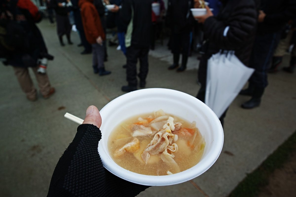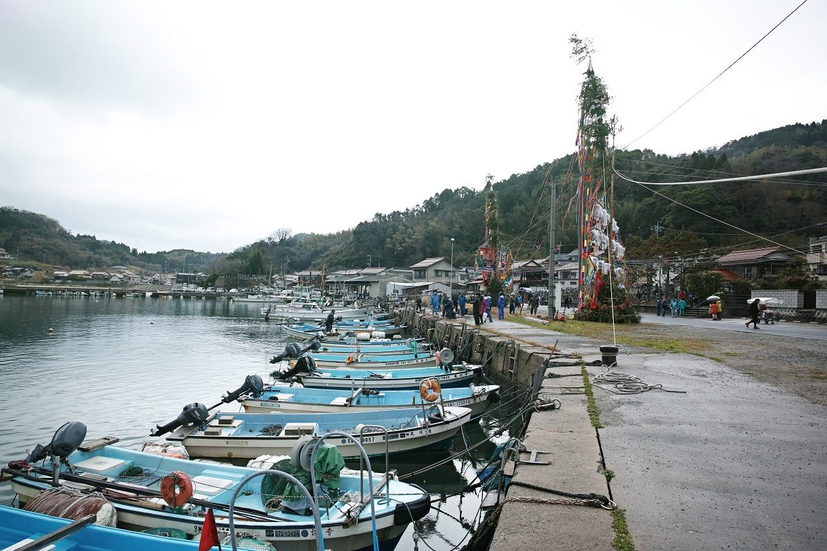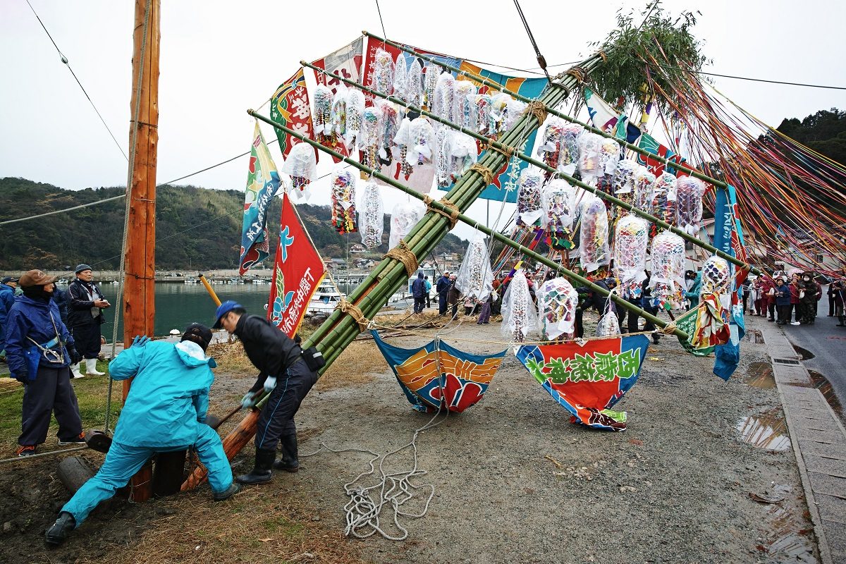 2本真っすぐに立ちました。美保関町片江地区は漁業の町として、片江船団が昭和30年頃まで、島根の沖合漁業、遠洋漁業の先駆的役割を持ち、遠くまで出漁していたそうです。トンド立ちができたら、地域の方々が暖かいトン汁をふるまってくれました。