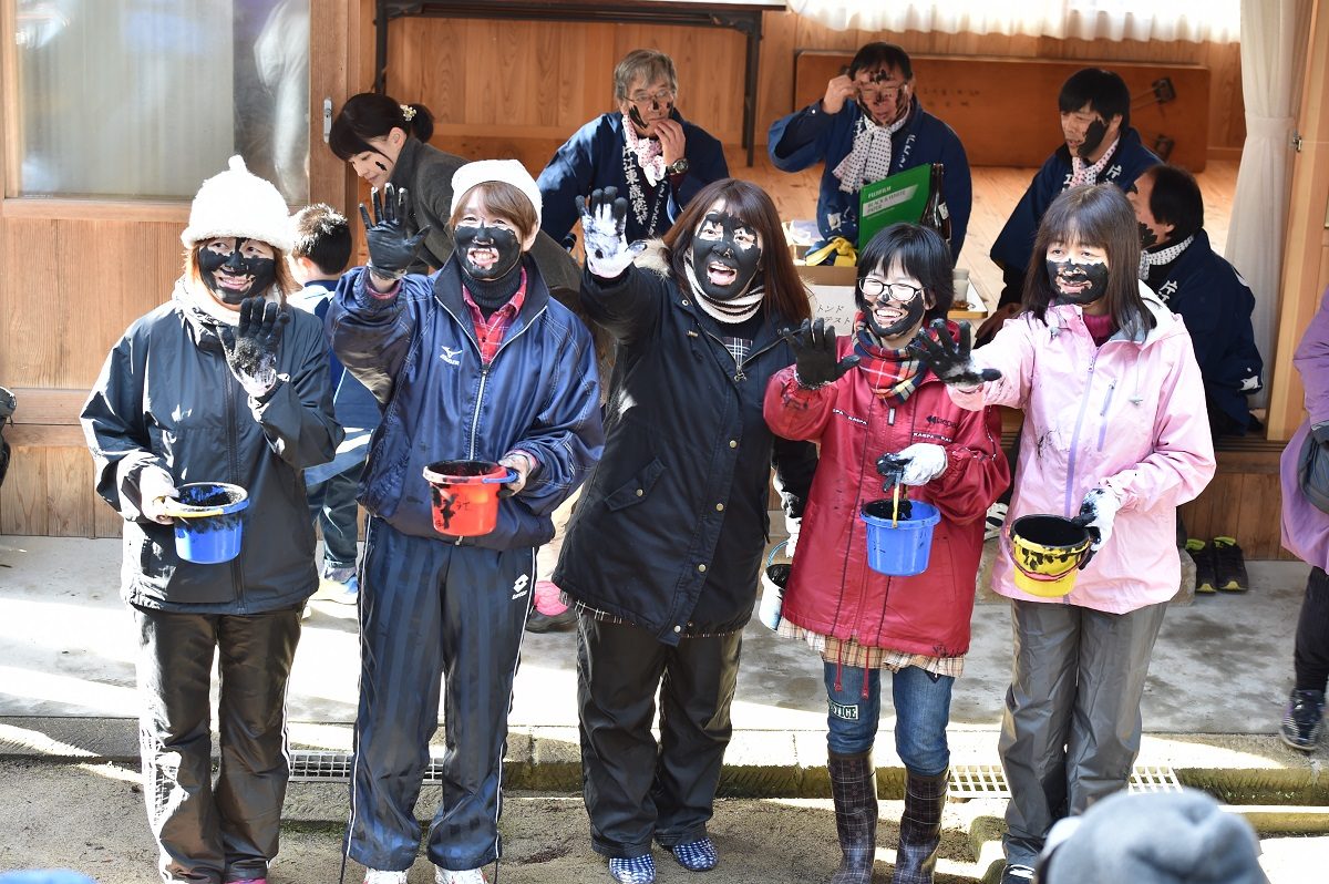 家にもお伺いぐりぐり!墨付けは、魔除けのおまじないでトンドが立ってトンド宮が担ぎ出されると、女性たちは風呂場やかまどの煤(すす)を集めて水で練った墨を持ち出し、輪切りにした大根などにふくませて道を行く人に塗るのが本来の塗り方らしいです。