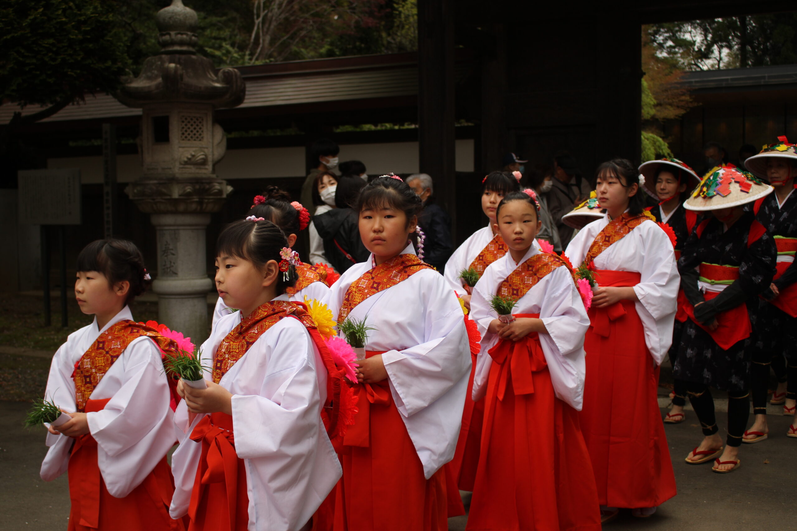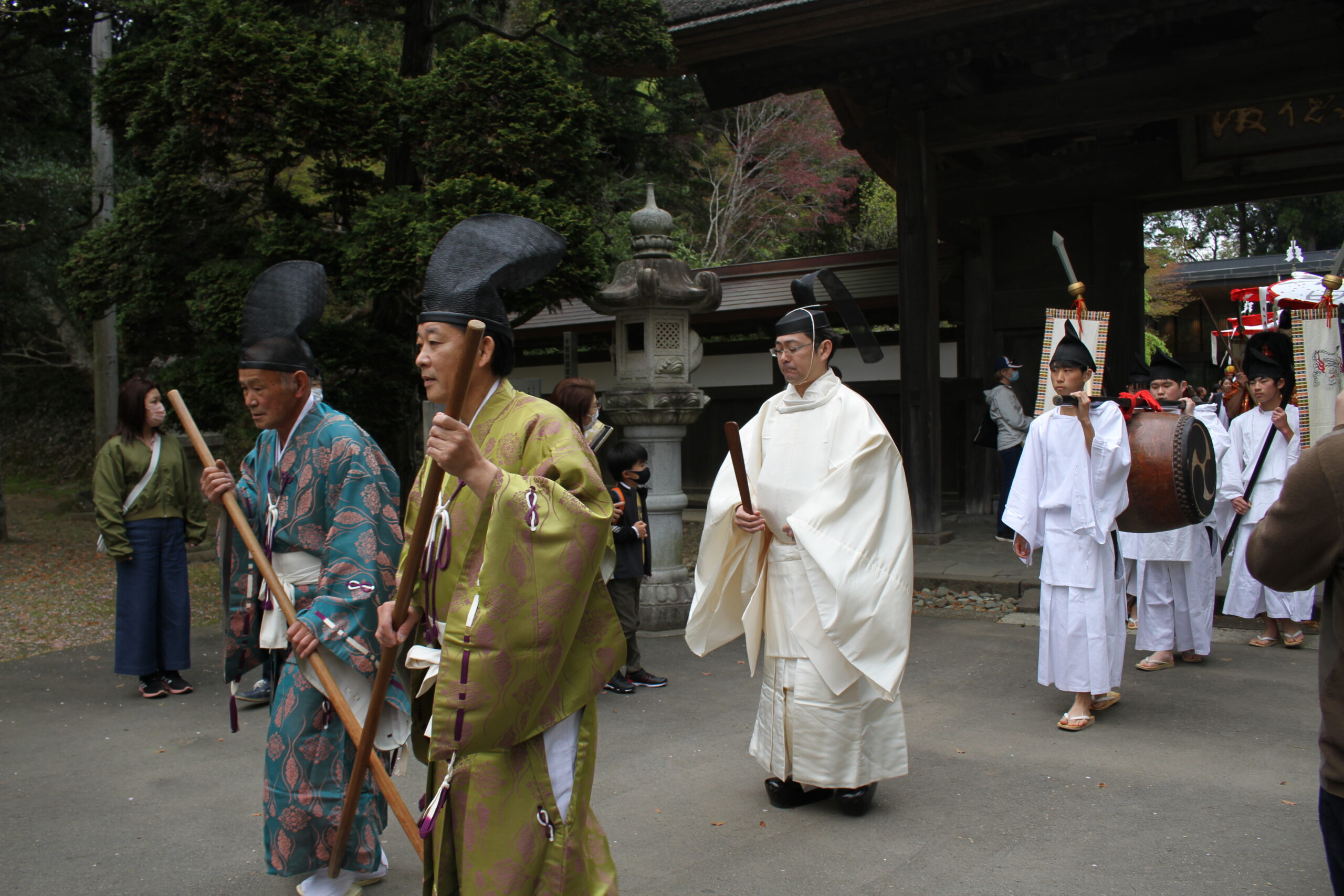 13時になると、お祭りが始まりました。古式の装いをした一団が参道の途中にある神徳館の敷地から列をなして出てきて、拝殿を目指します。