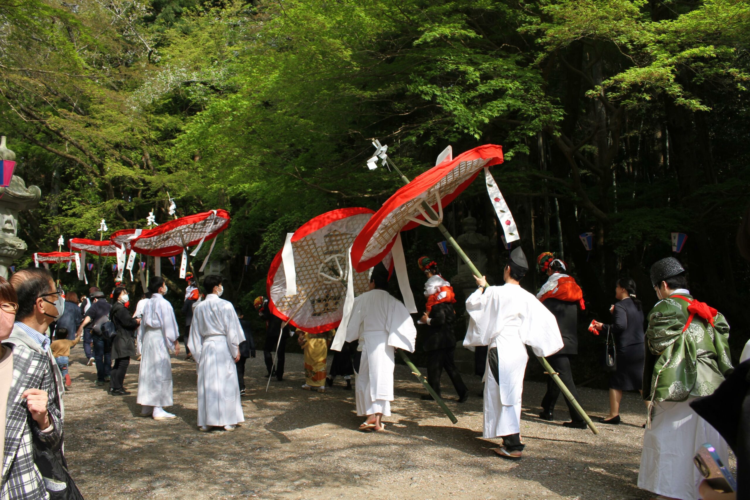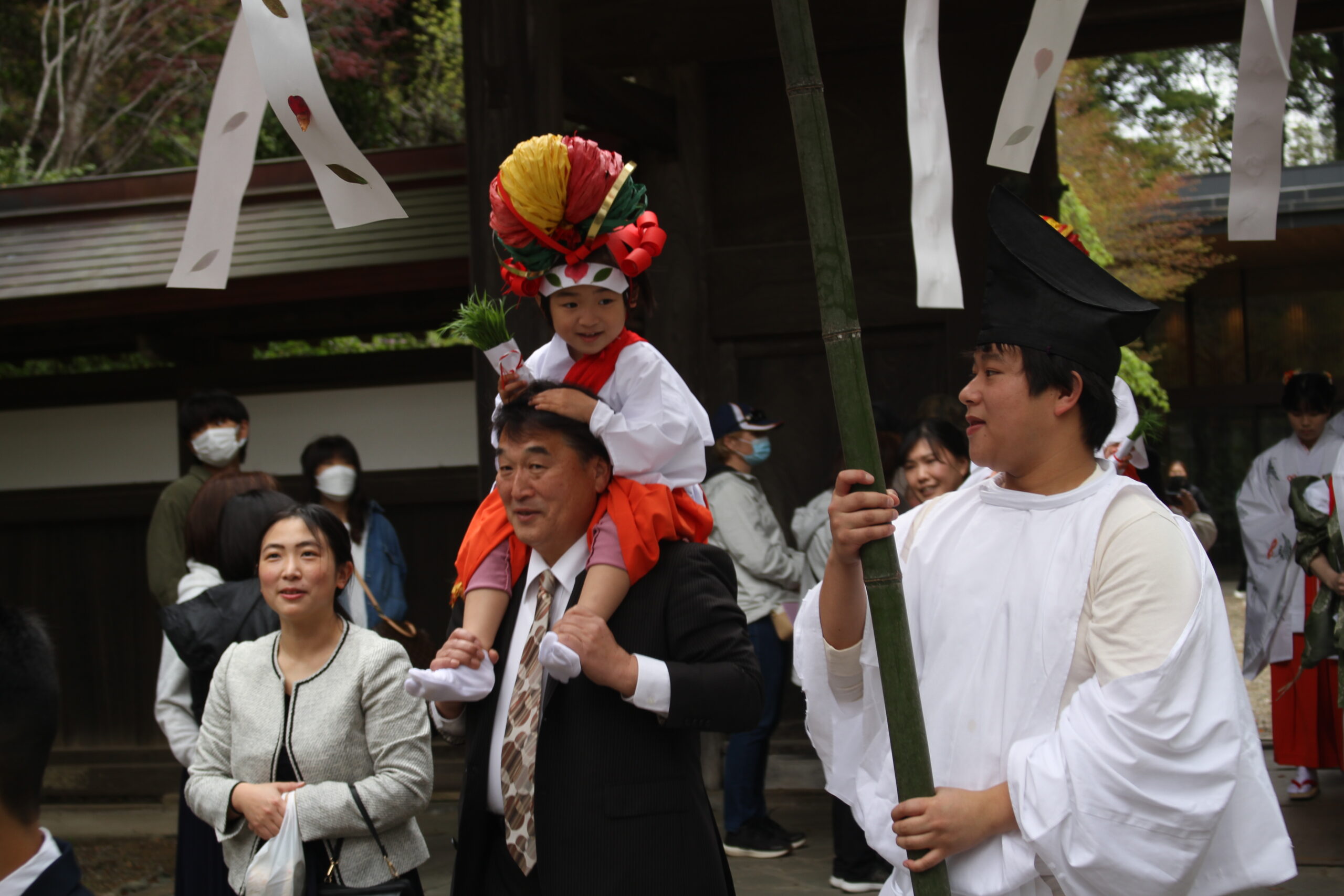 田植が終わると、御田植祭は終了です。再び、神社の本殿へと戻っていって、解散します。祭りが終わり、みなさんリラックスした表情を浮かべています。4年ぶりの通常開催ということで、関係者の皆さんも充実した二日間を過ごされたのではないでしょうか。