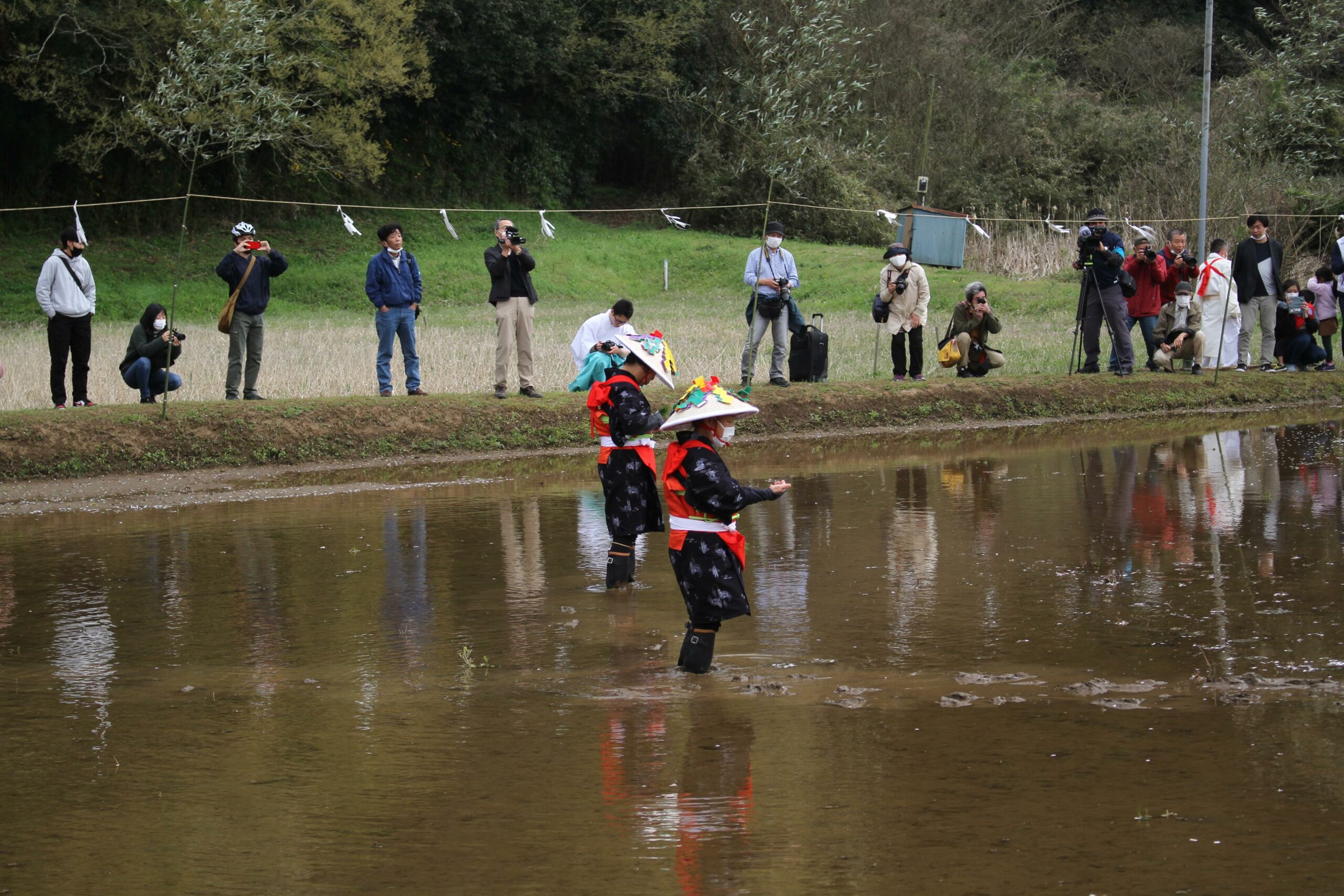 続いて、美しく着飾った早乙女たちが田んぼの中に入っていきます。足が田のぬかるみにはまって、かなり歩きにくそうにしている様子は、早乙女たちには悪いですが、少し滑稽な感じもあり、自然とこの場の雰囲気を明るく和ませているようです。