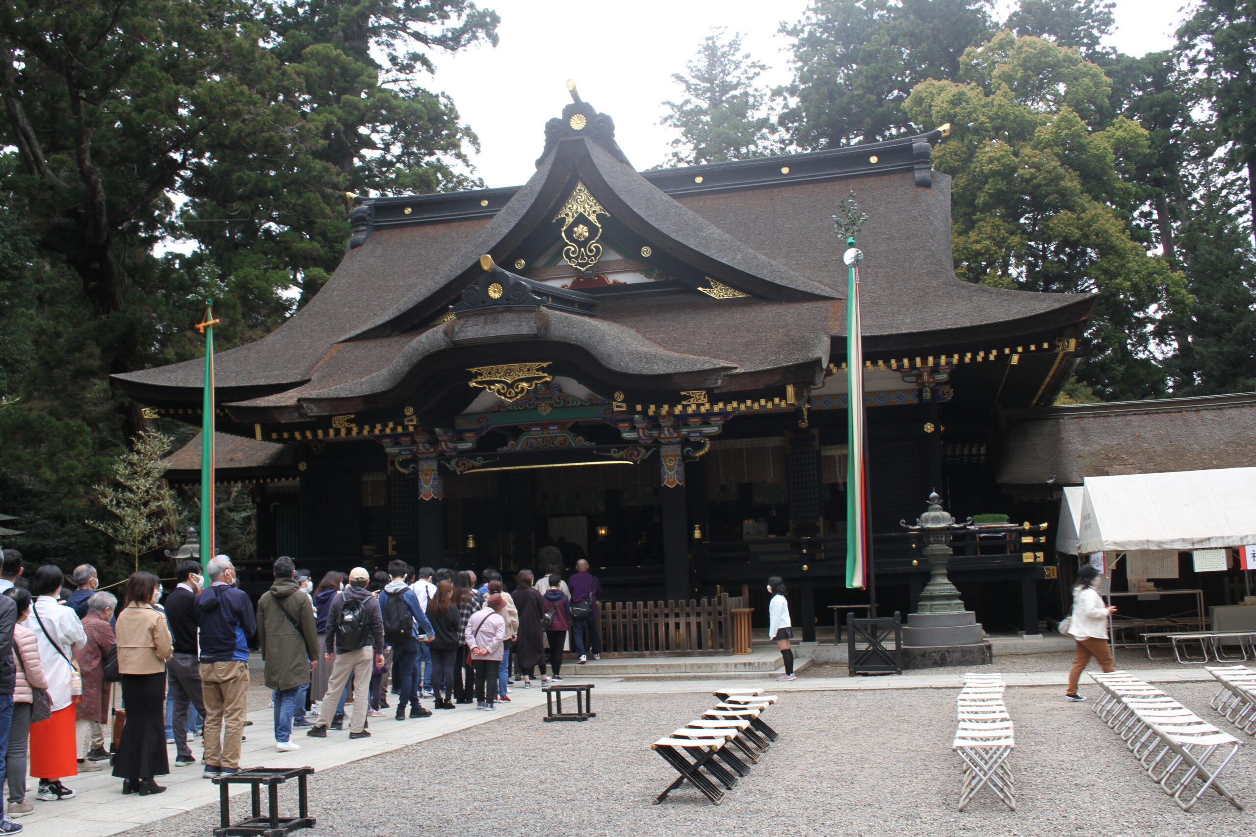 参道の階段を登って、立派な楼門をくぐると、これまた立派な拝殿と本殿が出迎えてくれます。お参りの列も大行列。お祭りに関係なく、参拝に訪れている人も多そうです。車椅子のお客さんも多かったので、車椅子用のスロープも整備されているのかもしれません(詳しくは神社にお問い合わせを)。