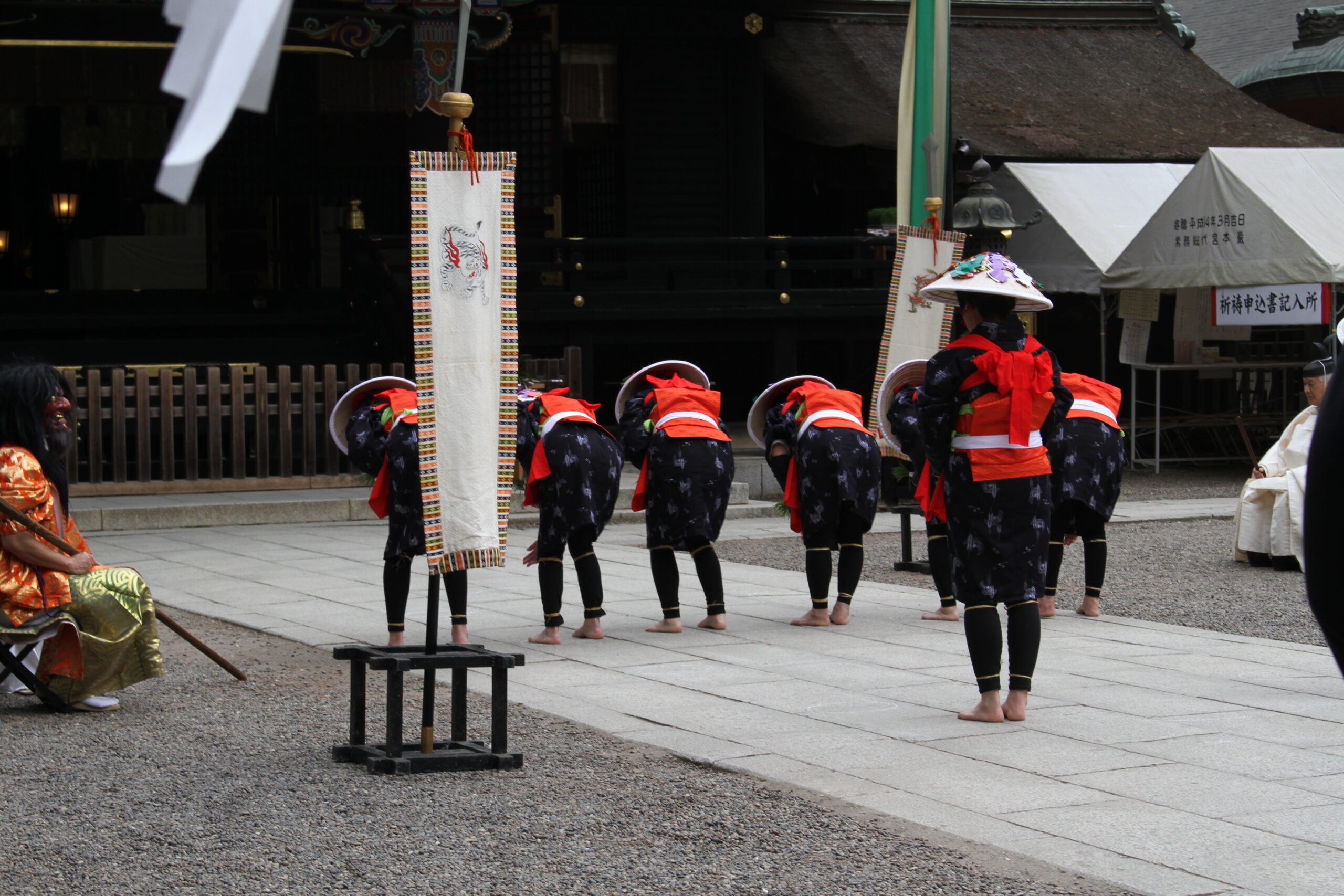 拝殿の前庭に一同が集まり、さまざまな行事が行われます。個人的には、特に少女たちによる田楽の舞いに興味が惹かれました。