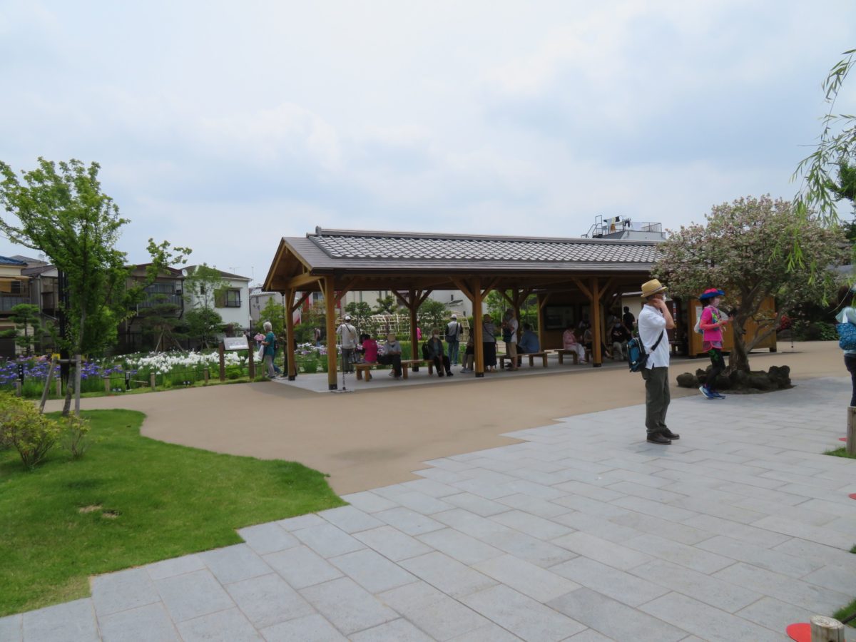 「花菖蒲園場」の東部には、屋根つきの休憩所が設けられているので、休みながら花菖蒲の花を鑑賞することができます。