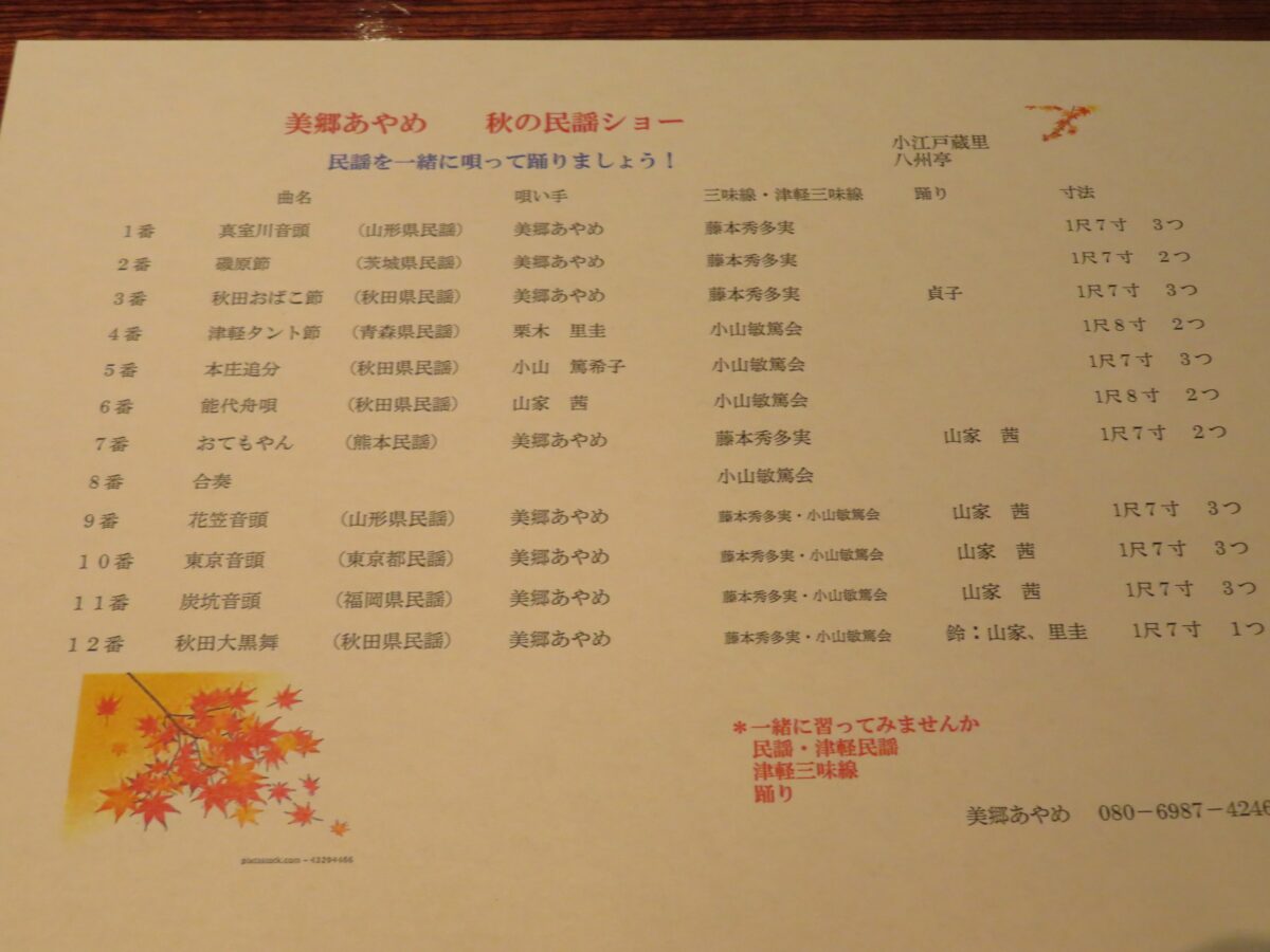 2021年10月23日の「秋の民謡ショー」のプログラム
