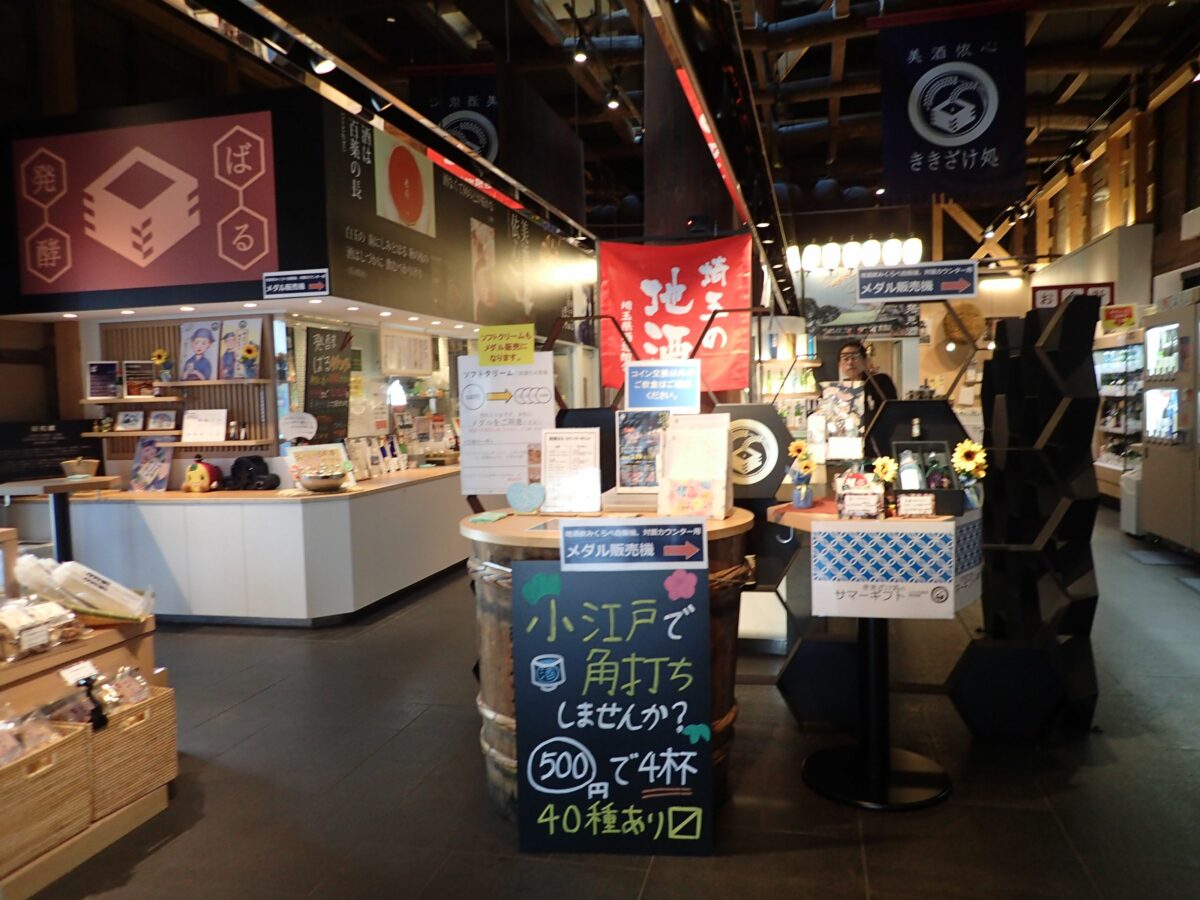 「伝統和芸鑑賞会」の会場となる「まかない処大正蔵」の西には、おみやげ処の明治蔵が隣接しており、店内には川越の土産物が並んでいます。反対の東側にはききざけ処の昭和蔵があり、埼玉県内で作られる地酒が勢揃いしているだけではなく、のみくらべのコーナーが設けられているので、様々な種類の地酒を味わうこともできます。