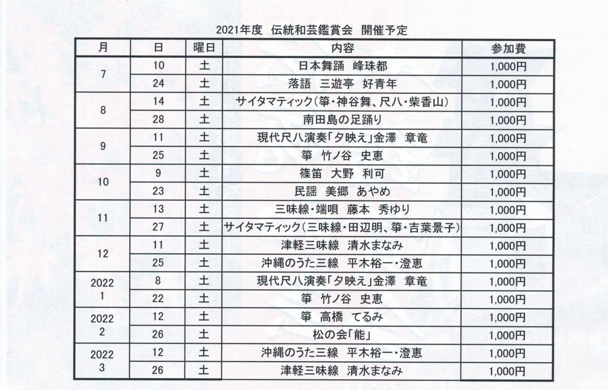 2021年7月~2022年3月の「伝統和芸鑑賞会」の開催予定