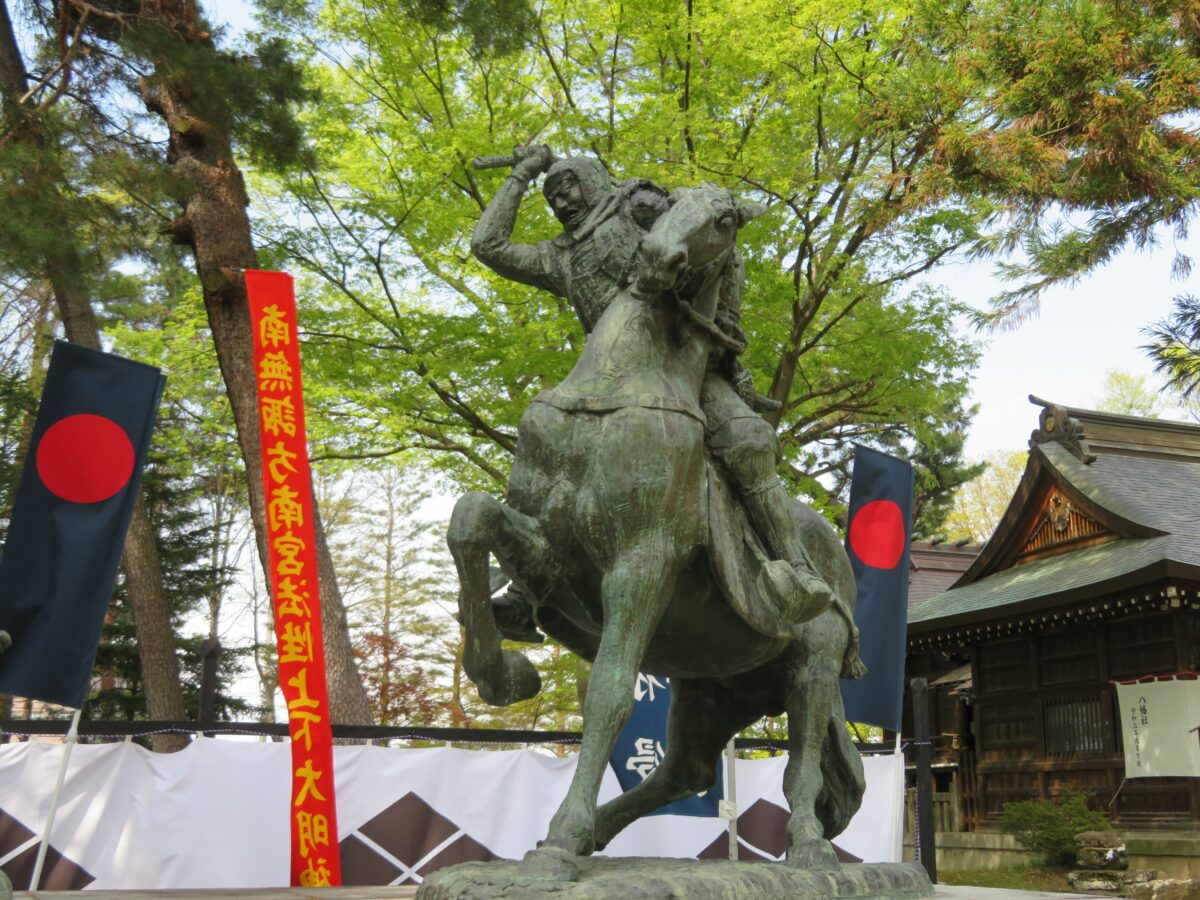 川中島古戦場八幡社では戦国時代の末期に、上杉謙信と北信濃の支配権を争った武田信玄が、勝鬨を上げたと伝わっています。本殿の南西には1969年のNHK大河ドラマ『天と地と』の放映を記念したブロンズ像が設置されています。約12年の間に5度、川中島周辺でにらみ合いましたが、最大の激戦が繰り広げられたのが1561年の4回目の合戦です。白頭巾を被った謙信が馬上から、床几に腰掛ける信玄に向かって斬りつけています。謙信の太刀を軍配団扇でかわす信玄の姿がリアルに表現され、鬼気迫る空気が放たれているようです。