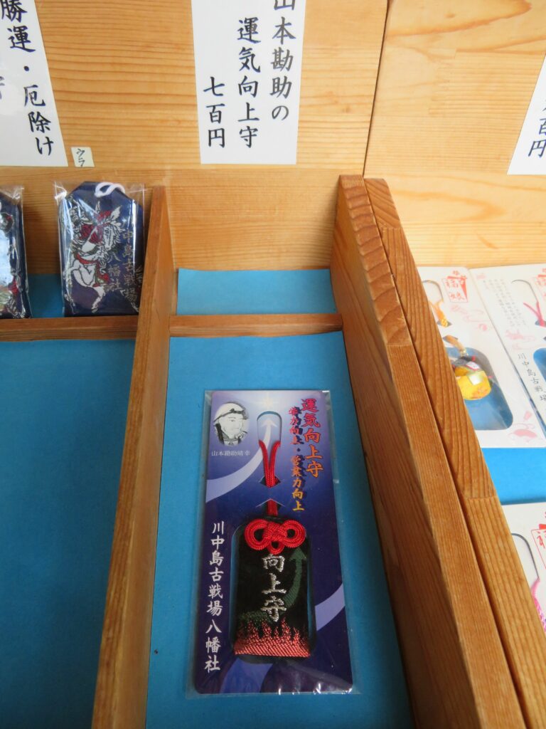 社務所の窓口に並ぶお守り、絵馬などの授与品にも数々の合戦で勝利を収めた武将の勝運のパワーが漲ります。