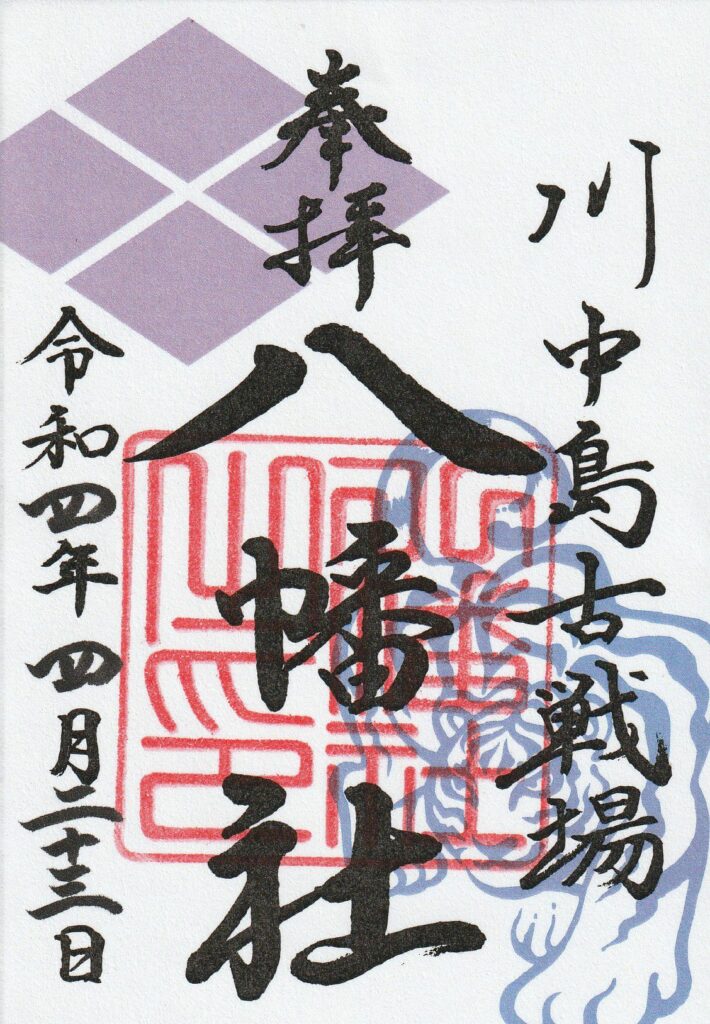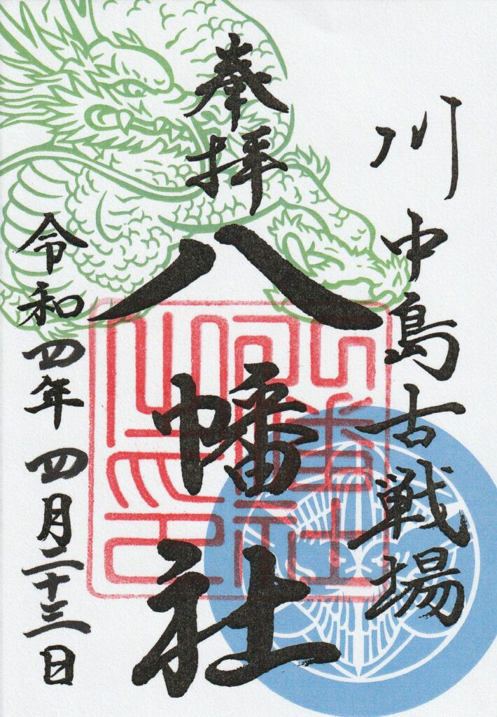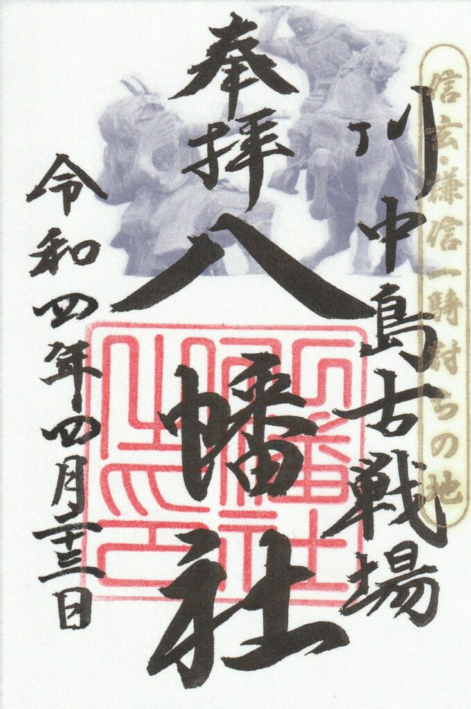川中島古戦場八幡社は、戦国時代に武田信玄と上杉謙信が死闘を繰り広げた長野市の川中島に鎮座しています。社務所で頒布される御朱印は、2人の武将に因むデザインが施され種類も豊富です。境内には謙信・信玄の一騎討ちの像も設けられ、戦国時代の雰囲気が漂います。