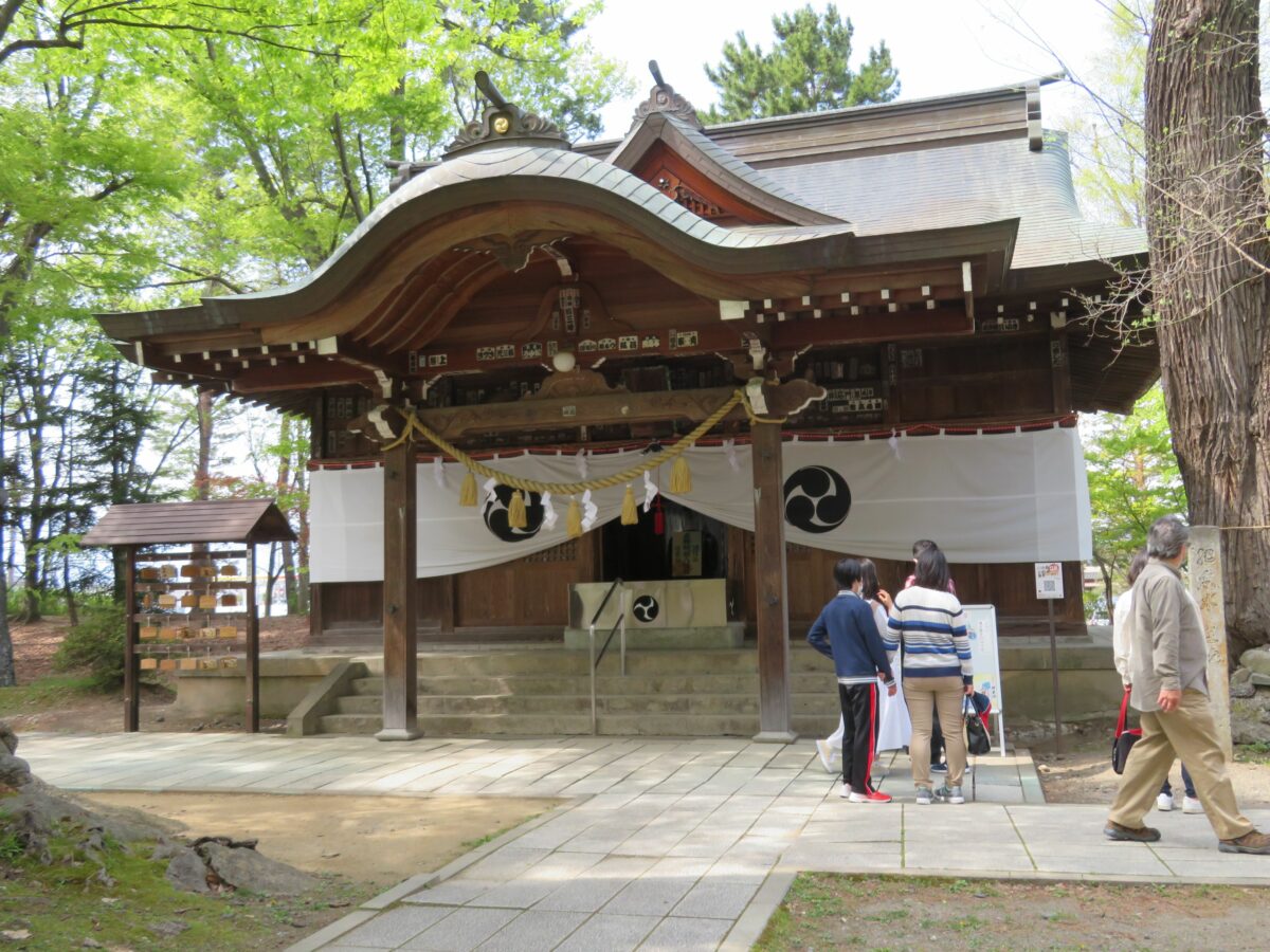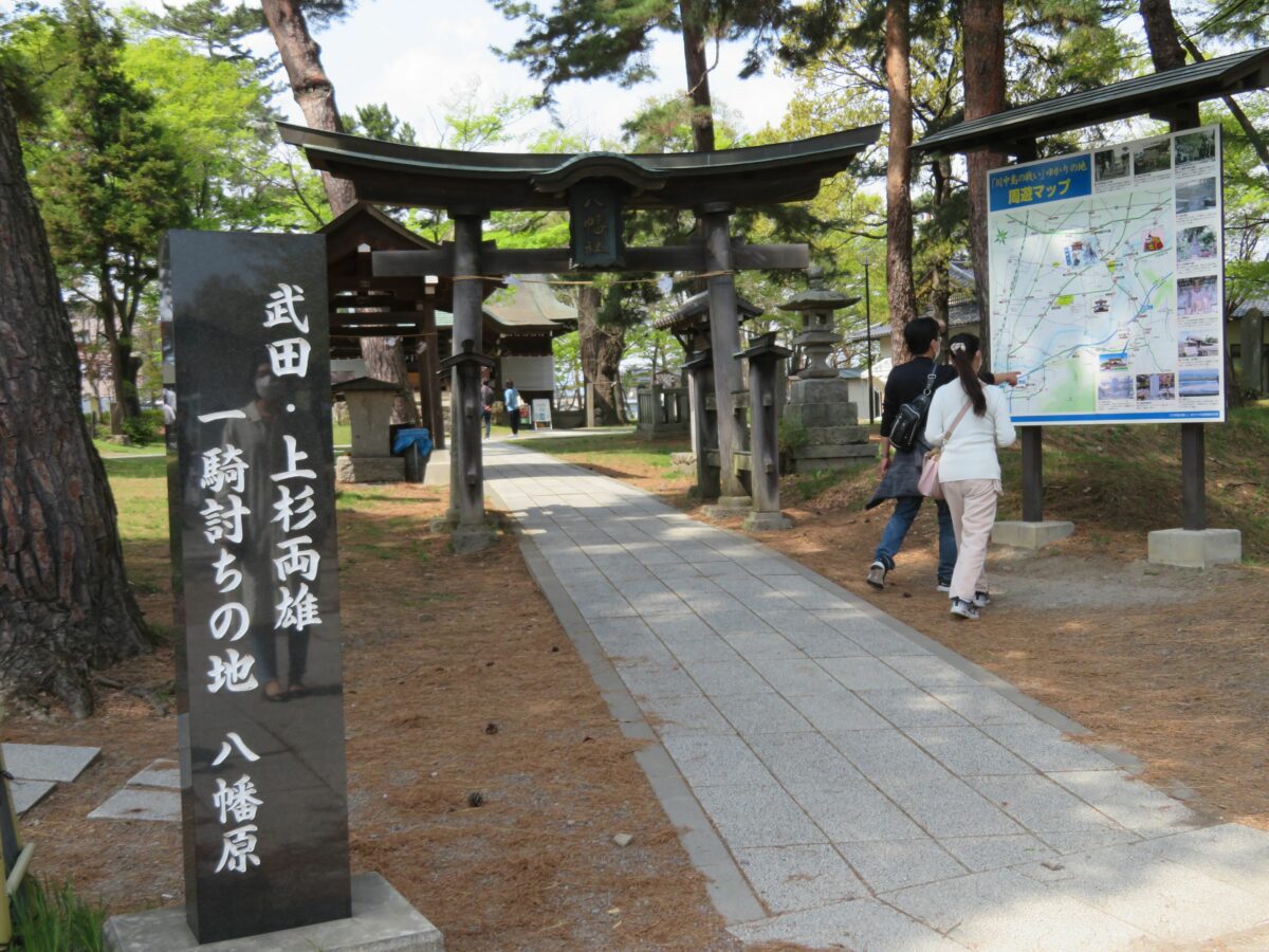 本殿の南に建立される鳥居の近くには、川中島の合戦の解説ボードや合戦図が掲示され、境内には戦国時代の雰囲気が溢れています。