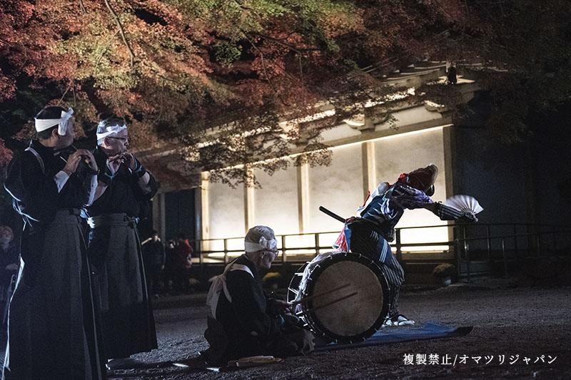 当日は、中尊寺境内をライトアップする「紅葉銀河」が開催されており、それに合わせて17時から金色堂前でも演舞が行われました。まずは本堂から金色堂まで行進して入場!ライトアップに照らされた紅葉の中を歩く担い手たちの様子は、とても堂々として見えました。