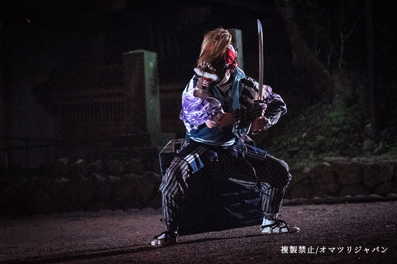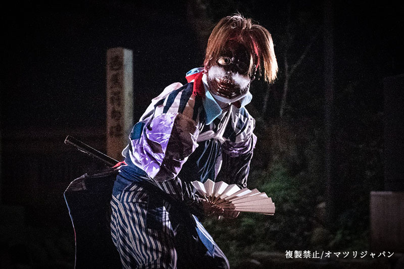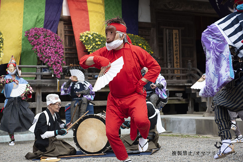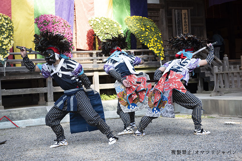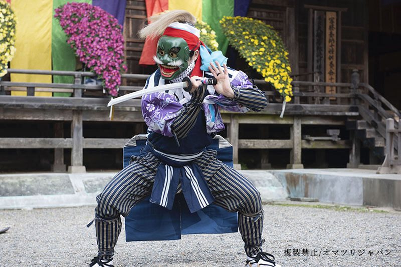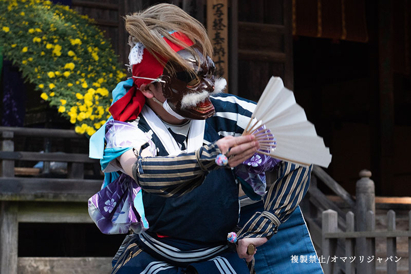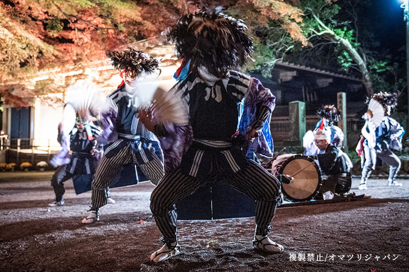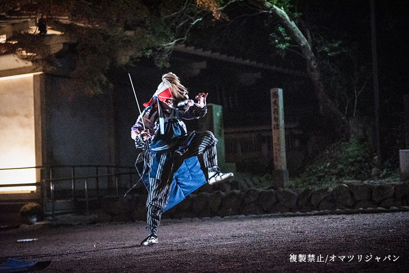 ライトに照らされた鬼の面と勇ましい動きは、どこか恐ろしげな雰囲気さえあります。