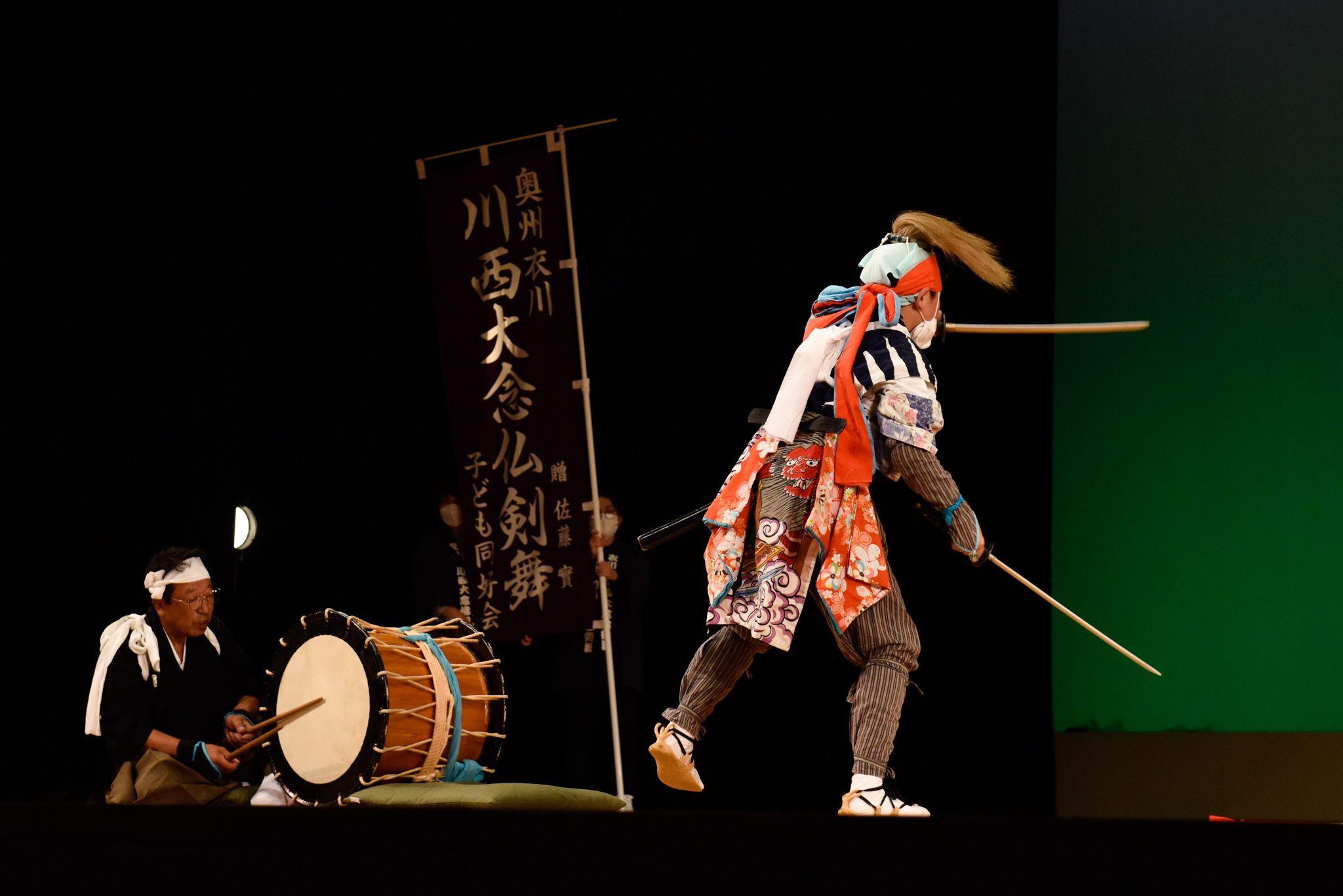 岩手県奥州市衣川地区に伝わる「川西大念佛剣舞(かわにしだいねんぶつけんばい)」は、世界遺産として知られる中尊寺とその始まりを同じくする歴史ある念仏踊りです。中尊寺の境内において、毎年5月1日~5日と11月1日~3日に開催される藤原まつりや、8月24日の施餓鬼会で奉納されます。