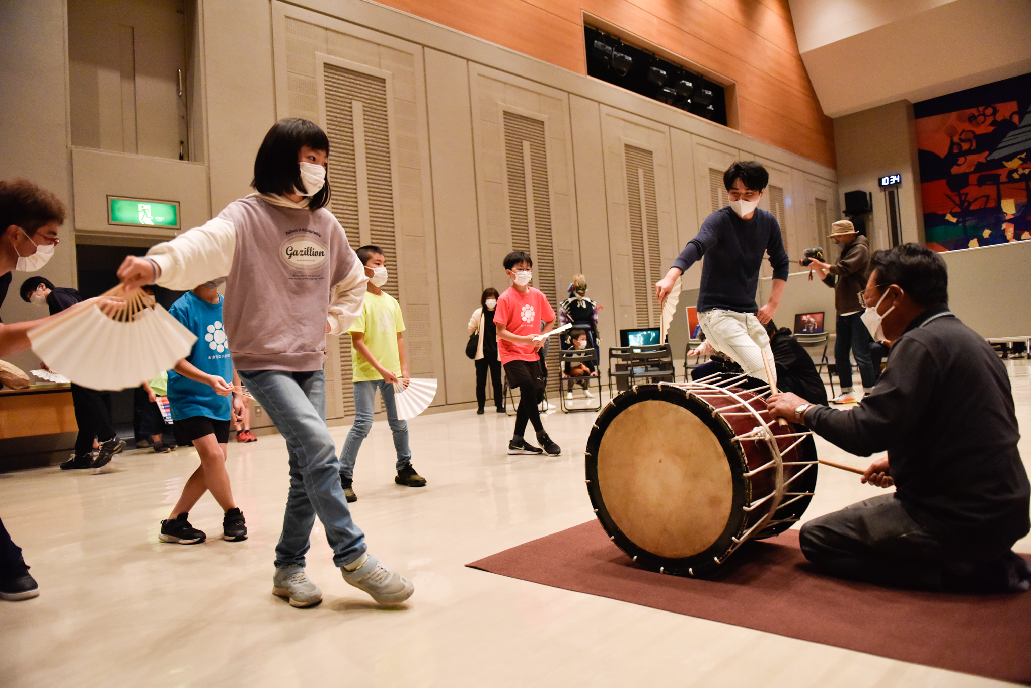 このイベントでは午前10時・11時からの2回、川西大念佛剣舞の踊り体験がおこなわれました。子ども達が楽しそうに踊る姿が印象的だっただけでなく、踊りの経験がある小学生が、ほかの小学生に教えるという場面もあり、継承活動が進んでいる様子が伺えました。