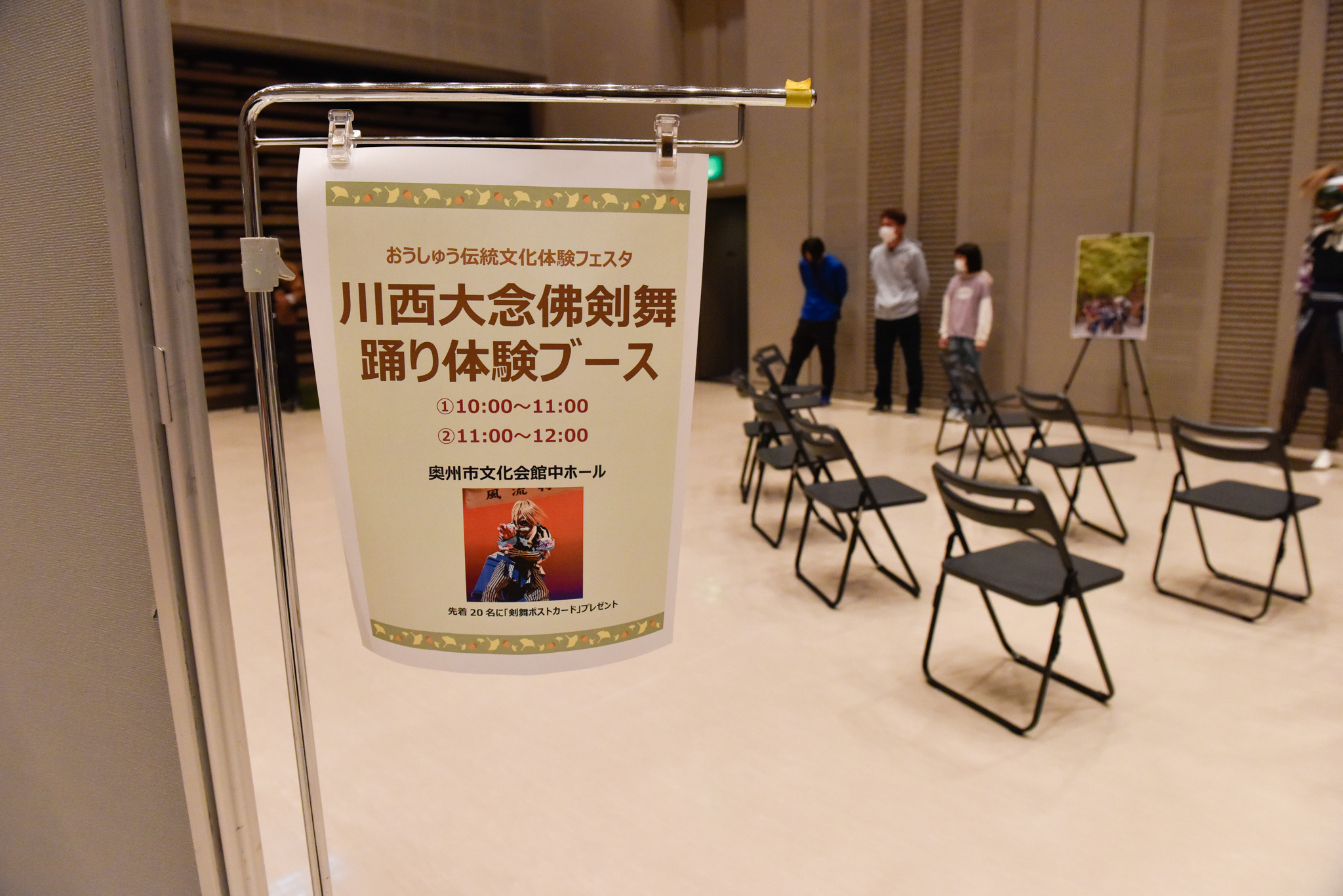 川西伝承館でおこなわれた練習会でのインタビューの次の日。岩手県奥州市の水沢市文化会館(Zホール)で開催されたイベント「おうしゅう文化体験フェスタ」で、川西大念佛剣舞の出展があるとのことで伺ってきました。
