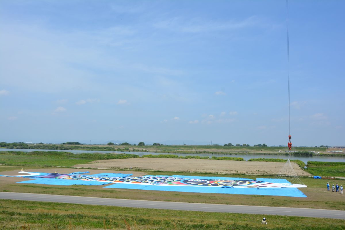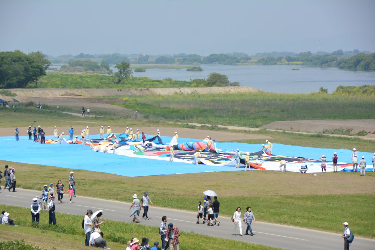 利根川河川敷緑地公園に敷かれるジャンボこいのぼり