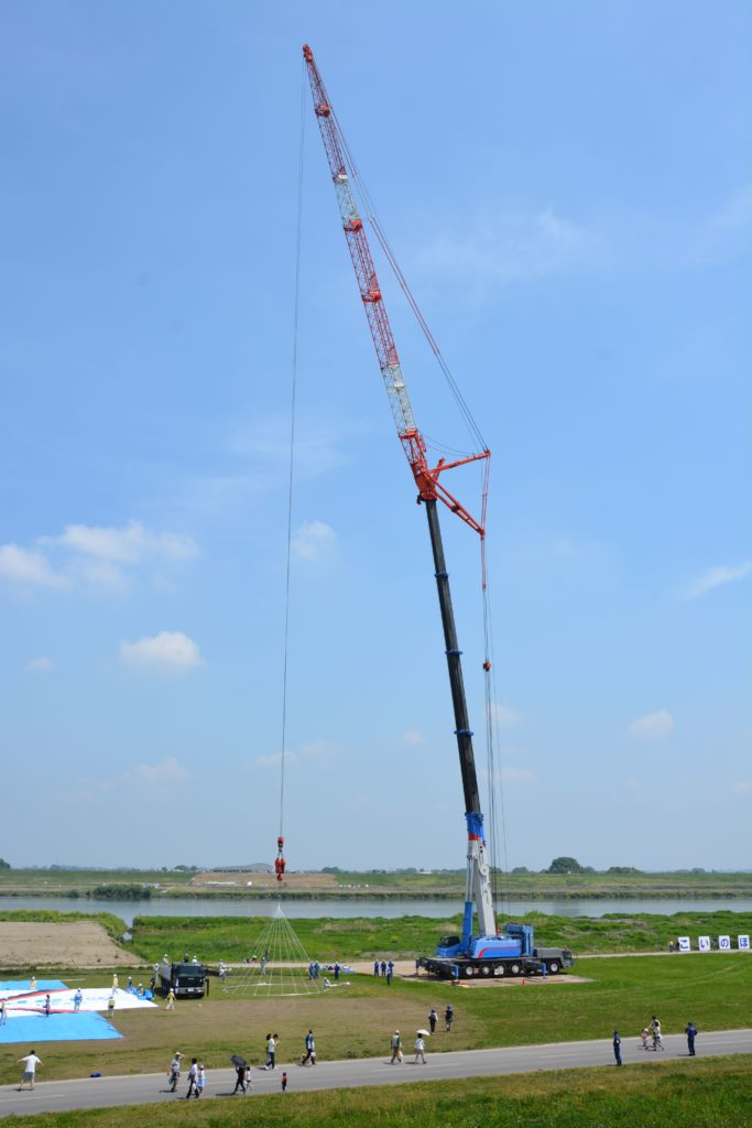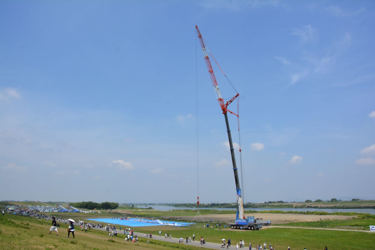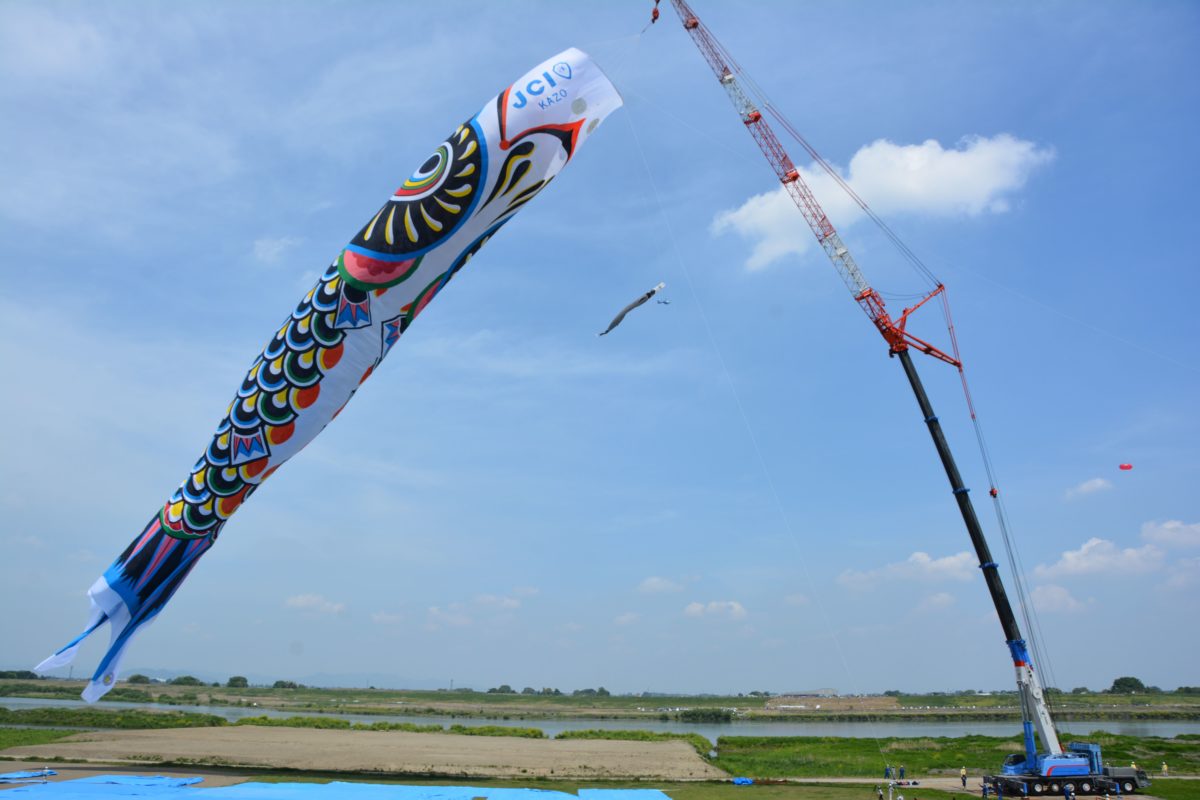 クレーン車で引き揚げられ上空で遊泳するジャンボこいのぼり