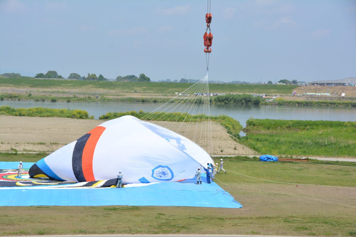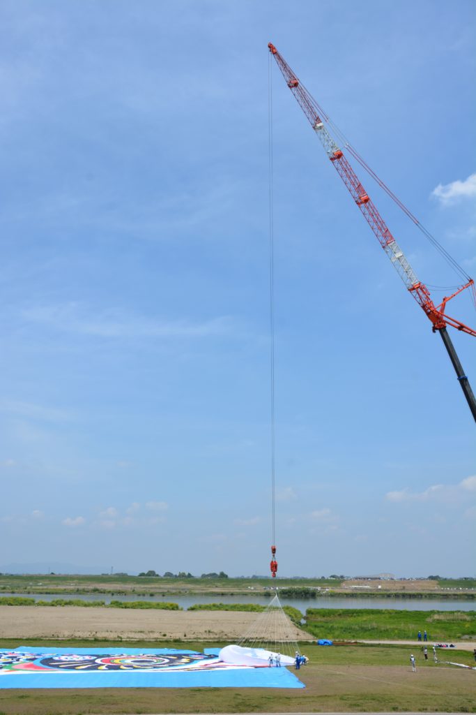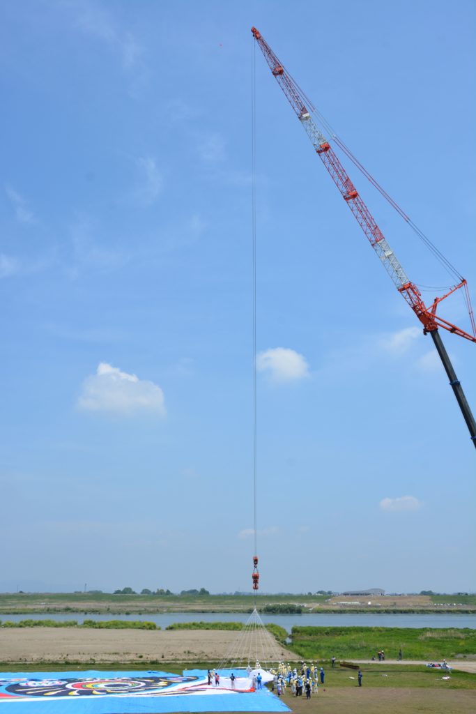 クレーン車に引き揚げられ呼吸を始めたジャンボこいのぼり