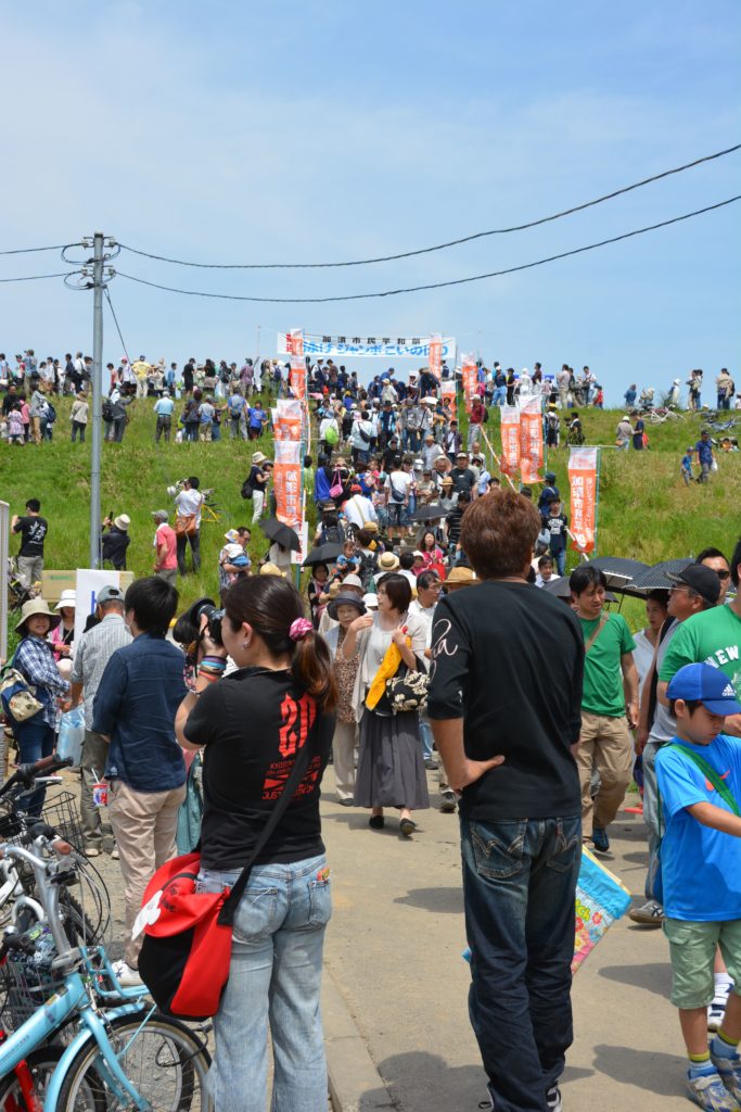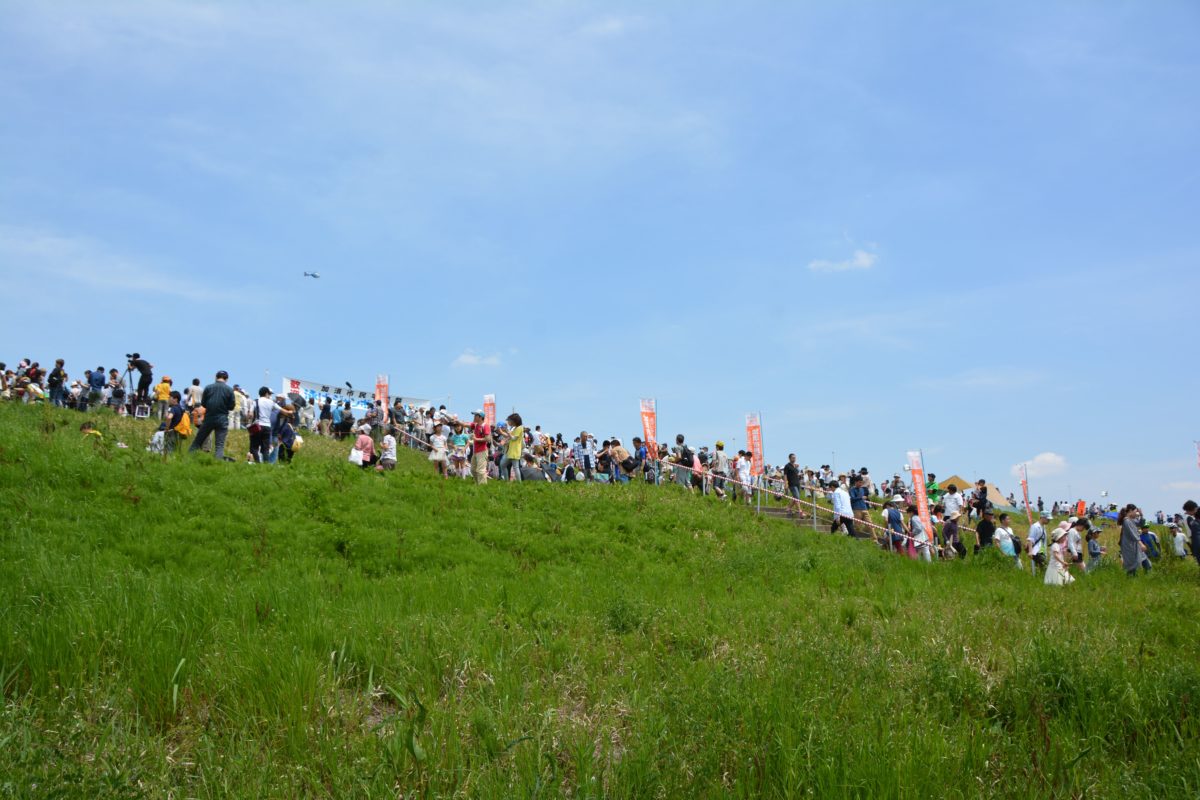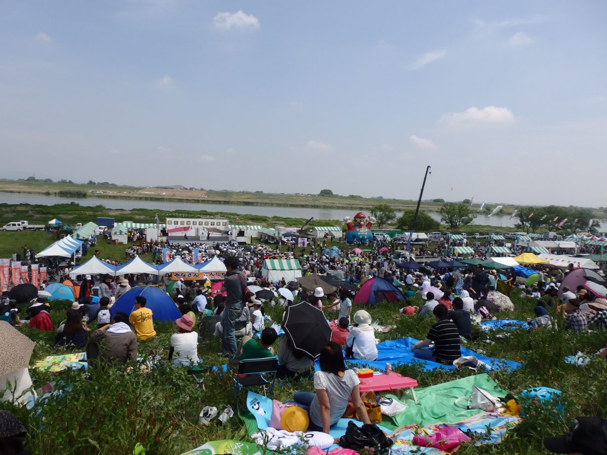 ジャンボこいのぼり開催日には、利根川河川敷緑地公園は大勢の人々で埋め尽くされます。土手や土手下を移動すれば、角度を変えてジャンボこいのぼりの姿を楽しむことができます。