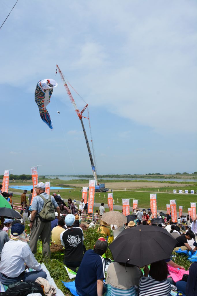 ジャンボこいのぼりが、クレーン車のロープに繋がれると、ゆっくりと上空に向かって引き揚げられていきます。口が地面から離れるに従って、こいは体内に空気を吸い込みます。