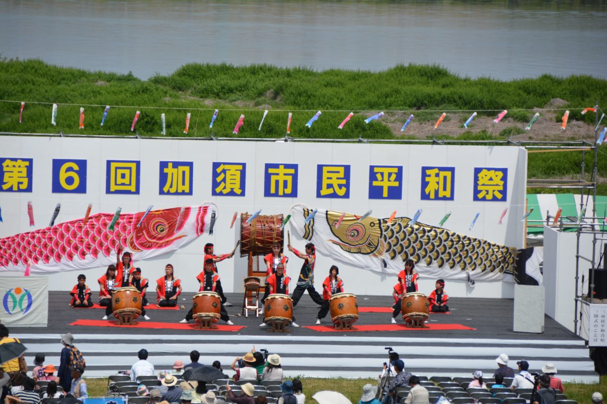 緑地公園のジャンボこいのぼり遊泳エリアに隣接する河川敷には観客席も準備され、和太鼓演奏などの数々のイベントが催されます。