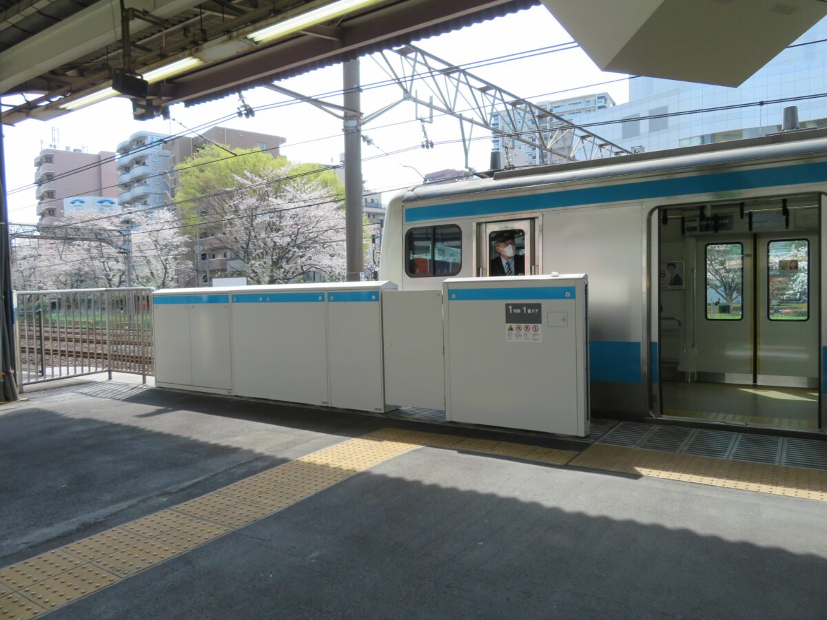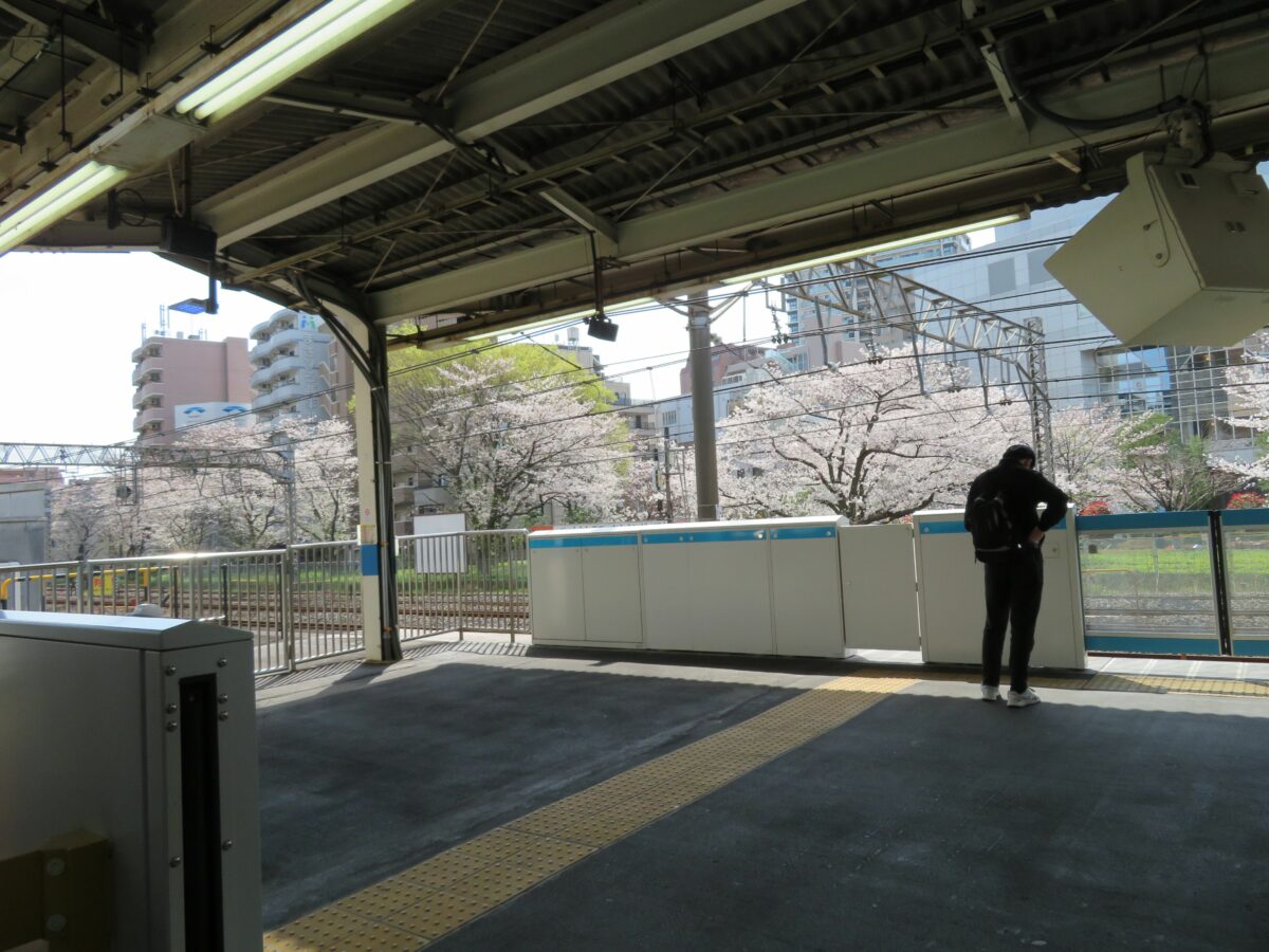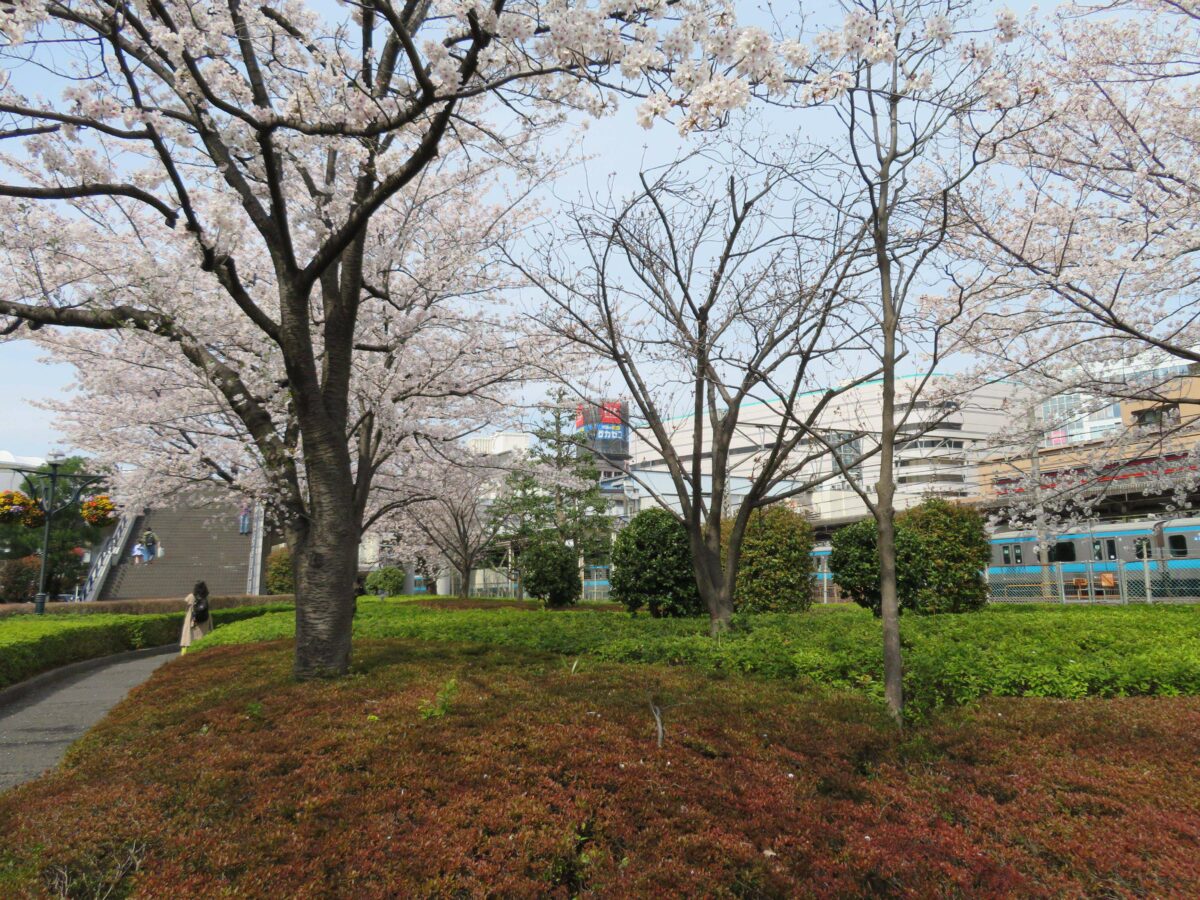 リリア沿い桜並木を眺め終わると、川口駅に到着です。駅のプラットホームからも西側に桜並木が続きます。また、川口駅の西口からは桜並木をすり抜けて走る京浜東北線の車両を見ることができます。