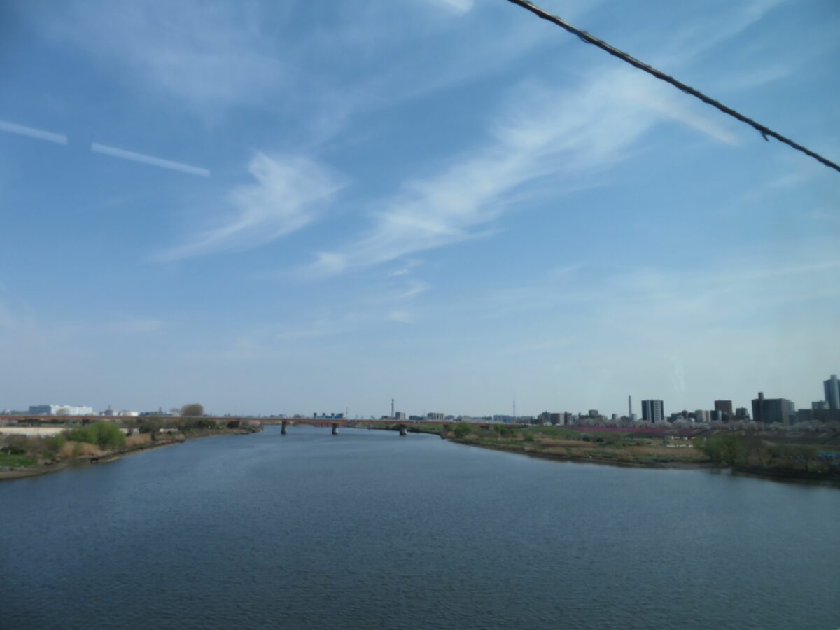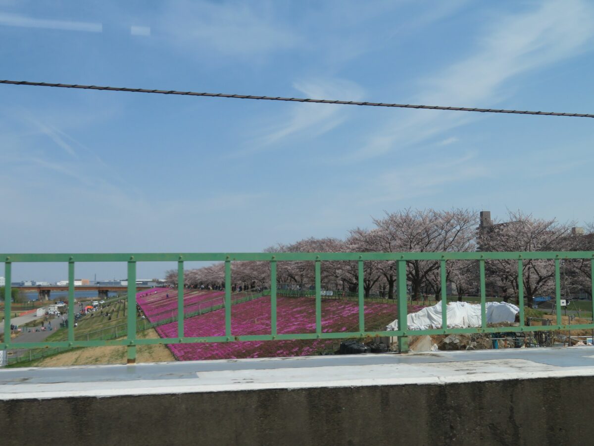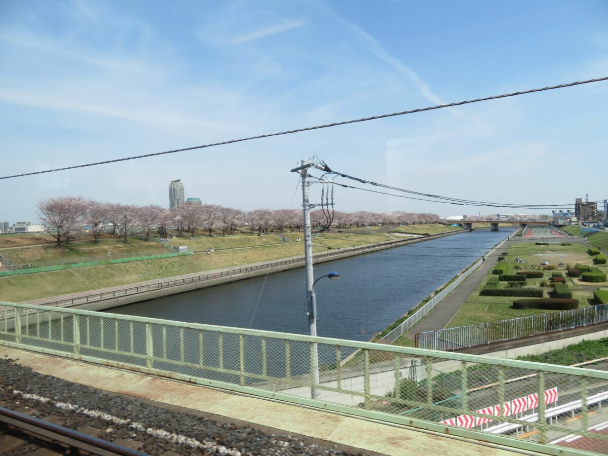 京浜東北線は、首都圏の1都2県を繋いでいますが、赤羽駅~川口駅の区間が東京都と埼玉県の境となります。2つの都県を明確に分けるのが荒川です。川沿いには桜が並木を作っており、車窓花見にもってこいです。赤羽駅を発車した下り電車は北に向かい住宅街を越え荒川を渡ります。荒川の南には隅田川の流れこむ支流があり、この間の中州に桜が植栽されているのです。桜並木は線路から東方向に垂直に繋がっているので、鑑賞時間は数十秒程度です。