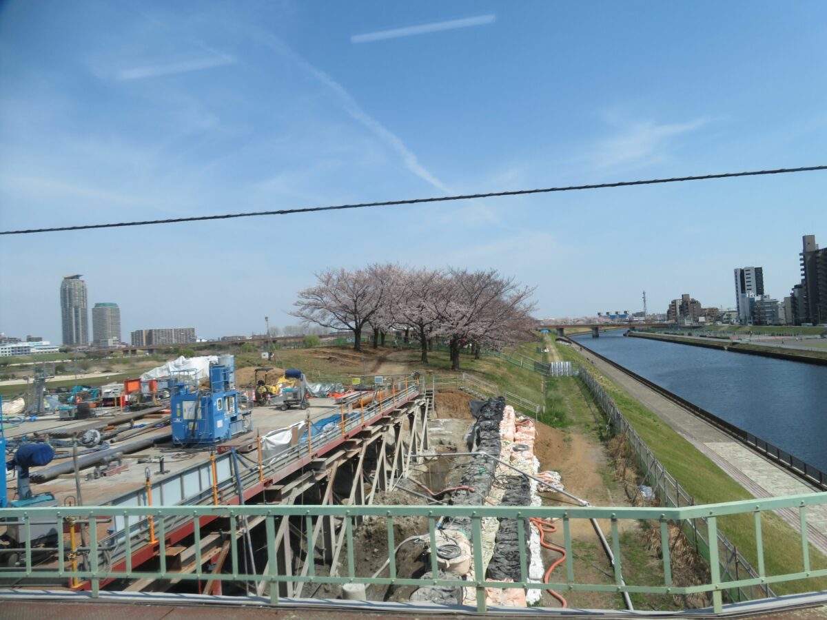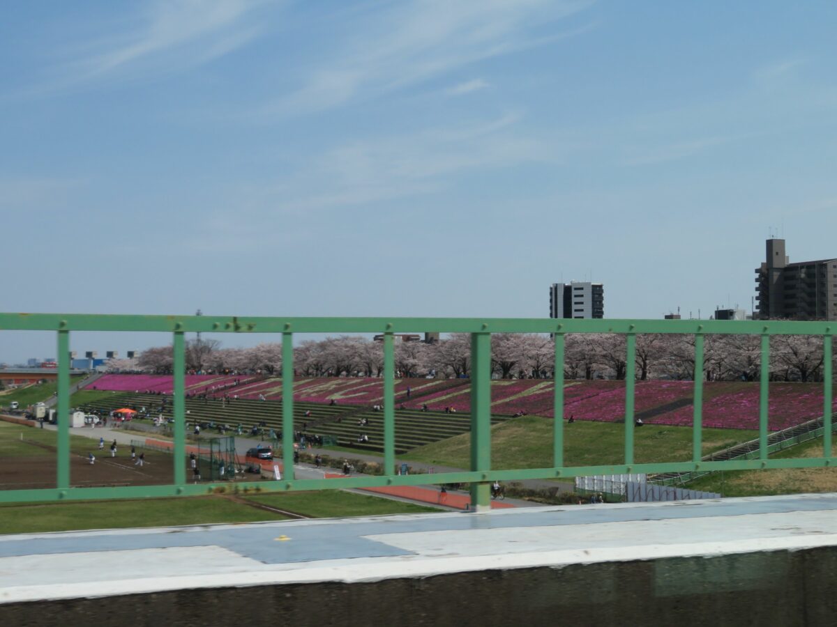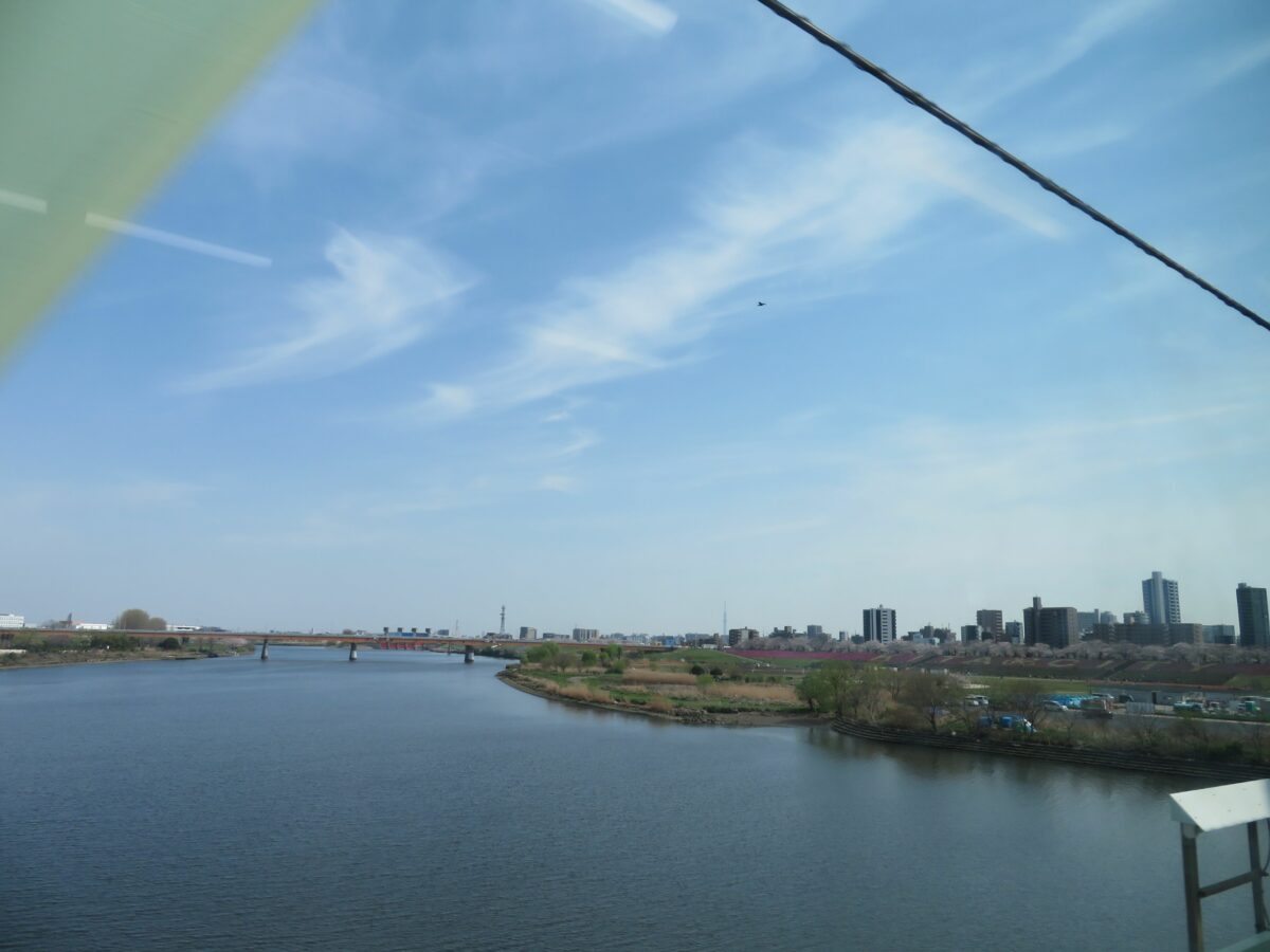 京浜東北線は、首都圏の1都2県を繋いでいますが、赤羽駅~川口駅の区間が東京都と埼玉県の境となります。2つの都県を明確に分けるのが荒川です。川沿いには桜が並木を作っており、車窓花見にもってこいです。赤羽駅を発車した下り電車は北に向かい住宅街を越え荒川を渡ります。荒川の南には隅田川の流れこむ支流があり、この間の中州に桜が植栽されているのです。桜並木は線路から東方向に垂直に繋がっているので、鑑賞時間は数十秒程度です。
