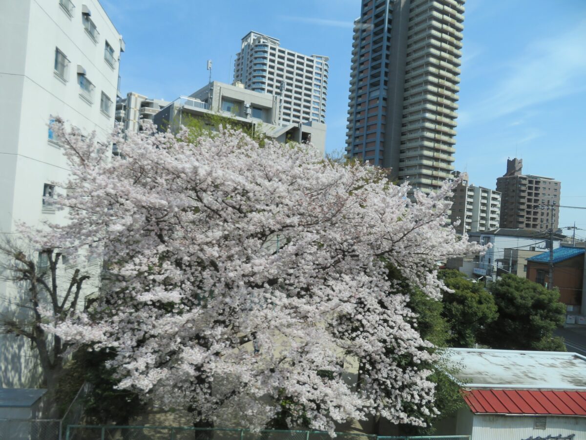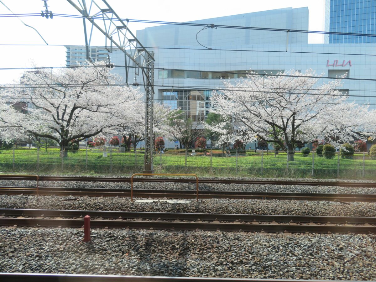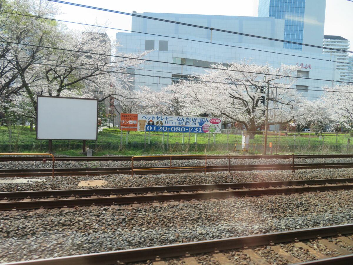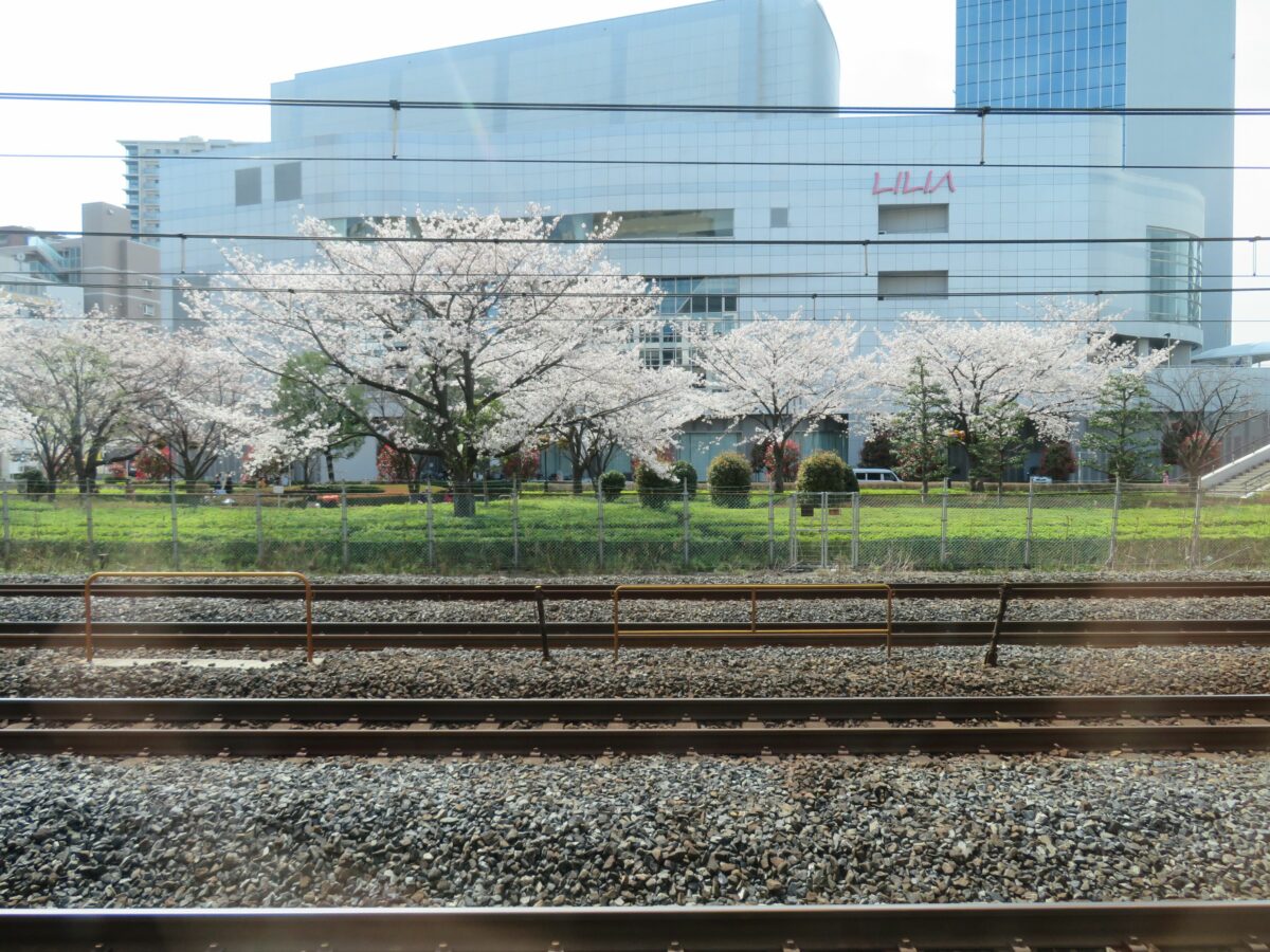 荒川を越えて埼玉県川口市に入ると、桜並木が広がるのは西側の車窓です。川口駅の西口に建つ総合文化センターのリリアに沿って桜が並木を作っているのです。リリア沿いの桜並木は線路に平行に繋がっています。