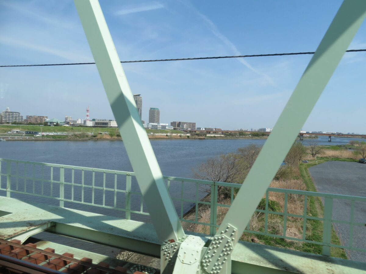 荒川支流の南岸を走る京浜東北線の下り電車の東側車窓