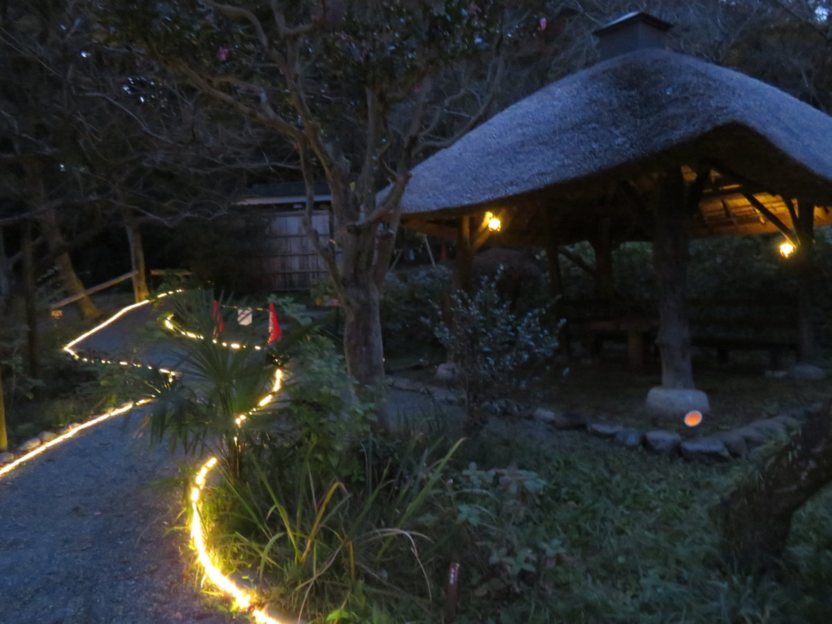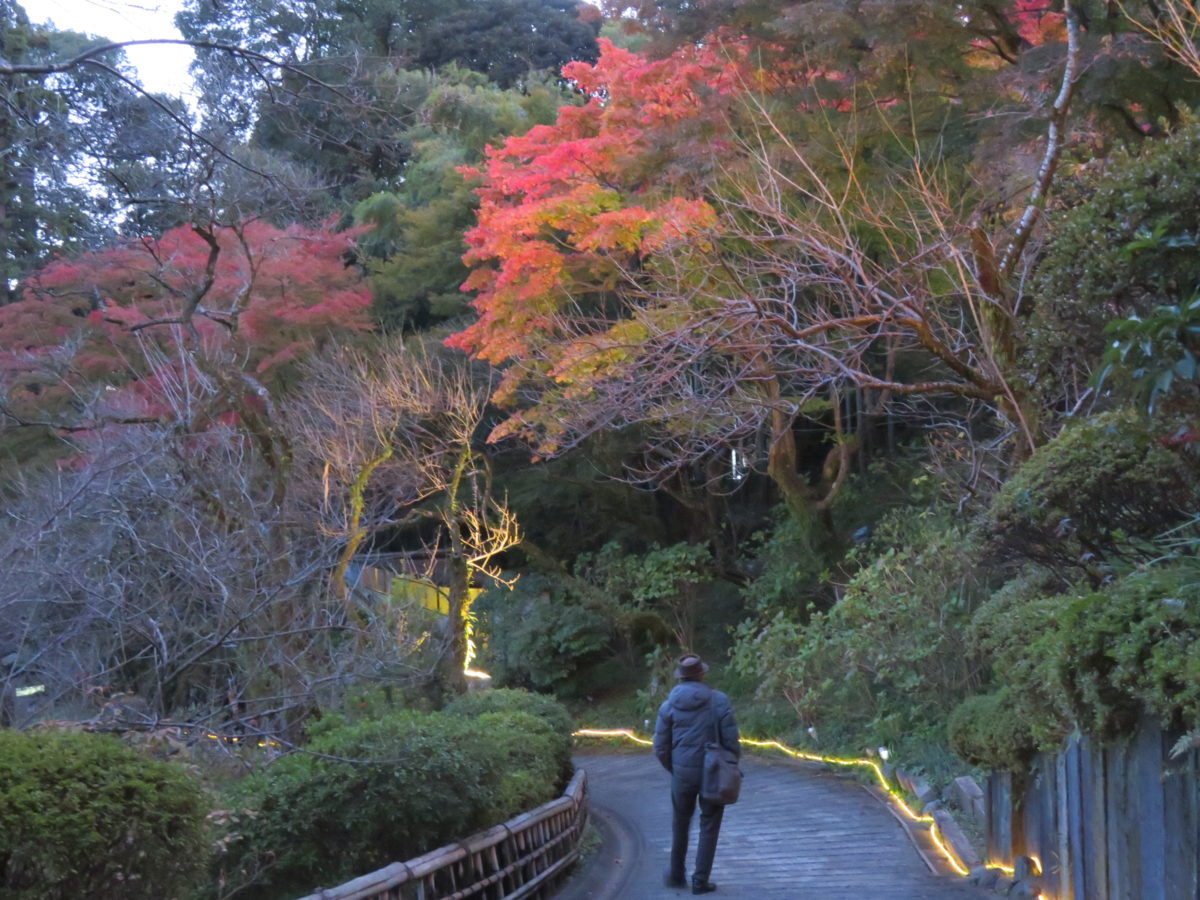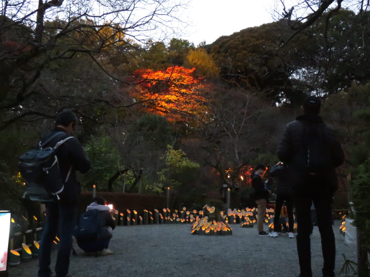 京王百草園の園内は様々な植物がまばらに育っているので、紅葉樹も群生しているわけではないので、紅葉スポットを見つけながら散策することになります。このため日中は、物足りなさを感じる人が少なくありません。京王百草園の紅葉の魅力は、土日の夜間にライトアップされたときに凝縮しているようです。点灯作業は来園者が行うのです。電池式の蝋燭の灯りを燈して竹筒に入れていきます。明るさが増すにつれてワクワク感が大きくなります。全ての竹筒から蝋燭の光がこぼれる頃には、紅葉がファンタジックな姿を見せてくれます。