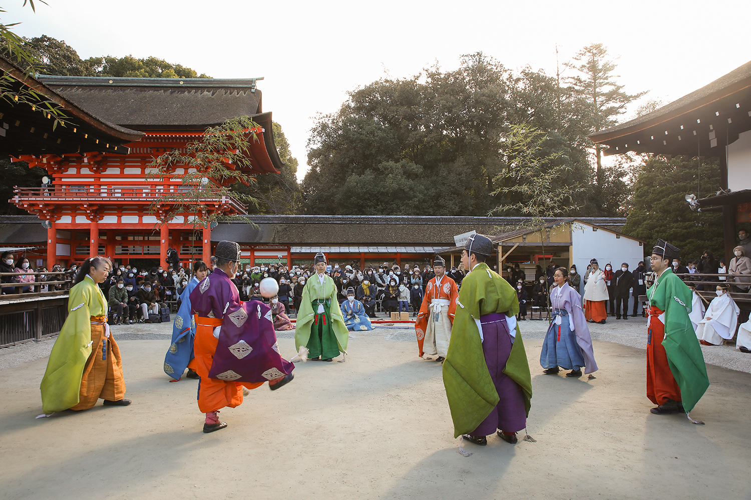 下鴨神社では毎年1月4日に「蹴鞠(けまり)はじめ」が行われます。