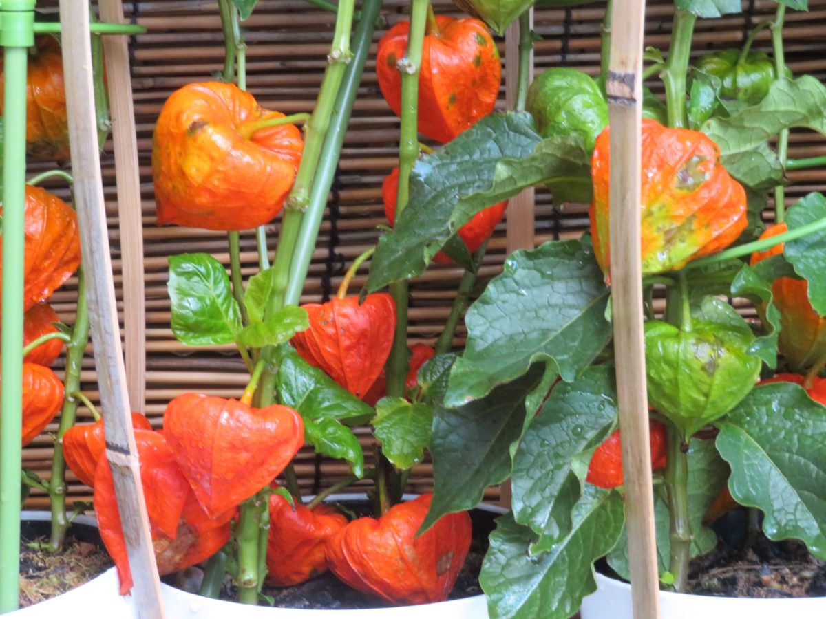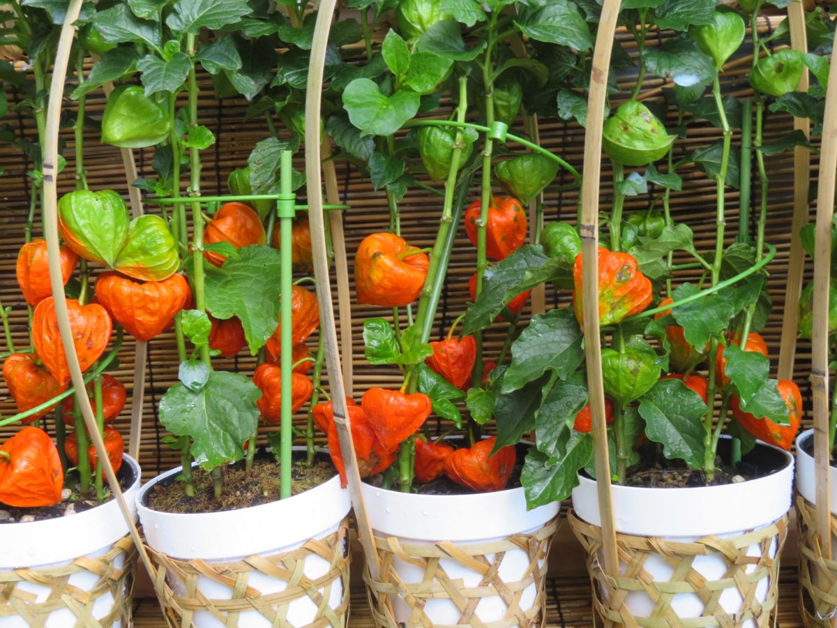 果実を包む萼が赤色のちょうちんがぶら下がる「ほおづき」