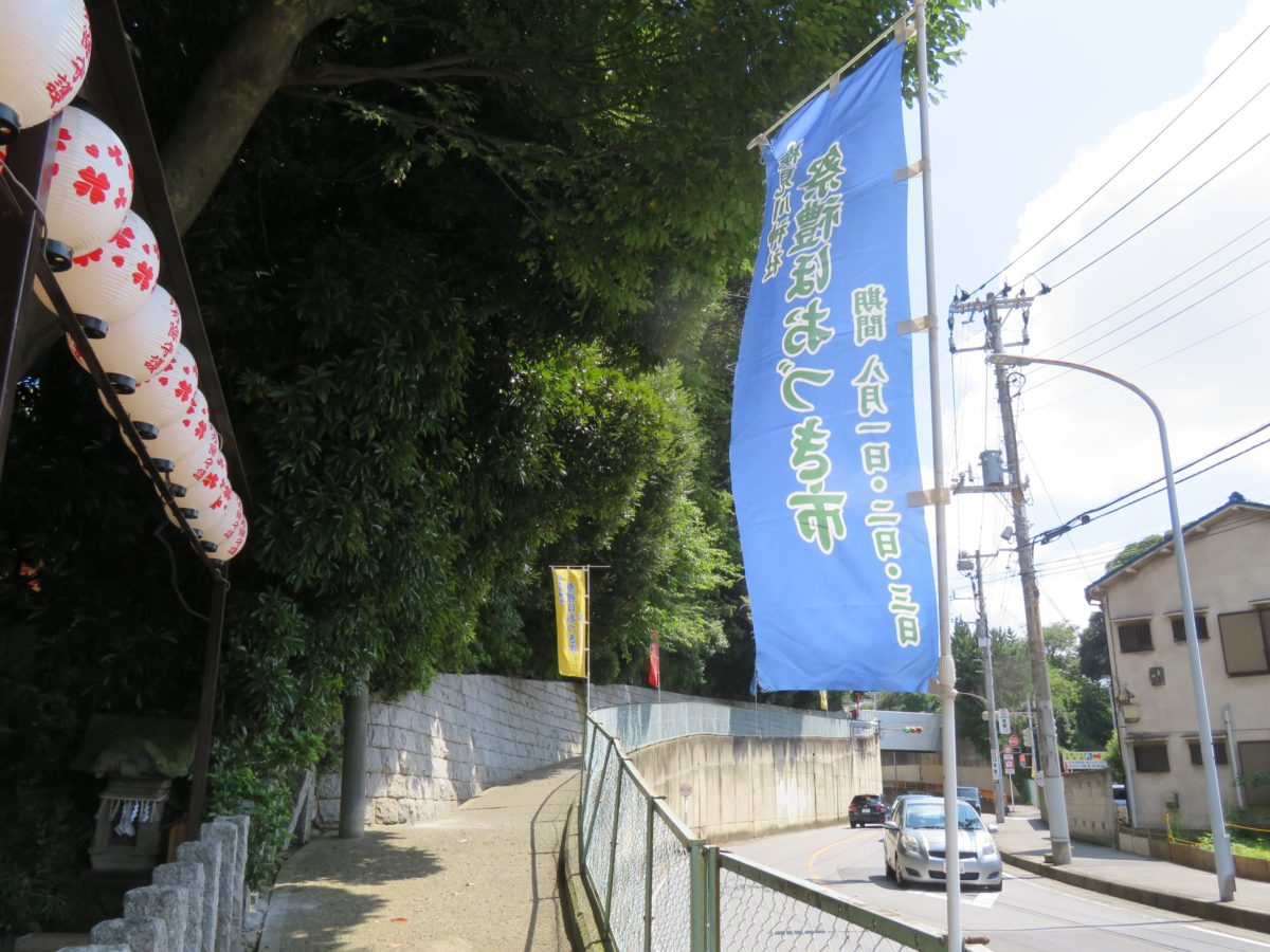 検見川神社の側道に建てられた「検見川神社ほおづき市」の幟