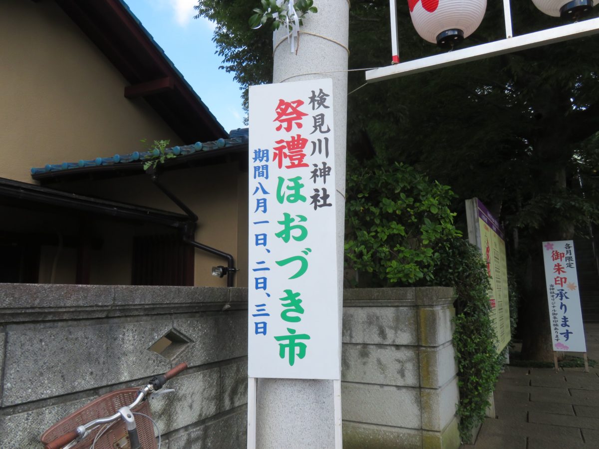 検見川神社鳥居の下の「検見川神社ほおづき市」の開催案内