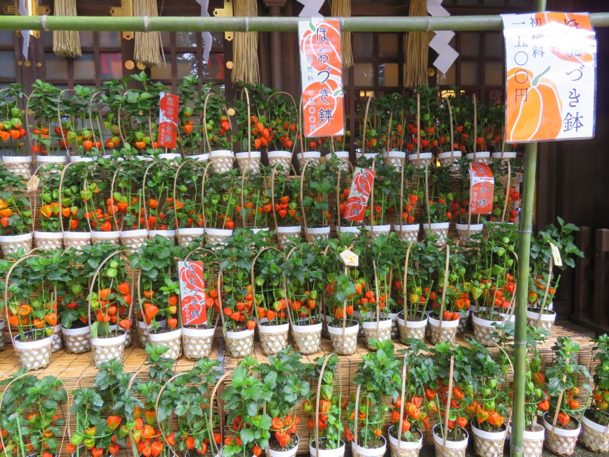 左右を「ほおづき」の鉢植えが埋め尽くす本殿