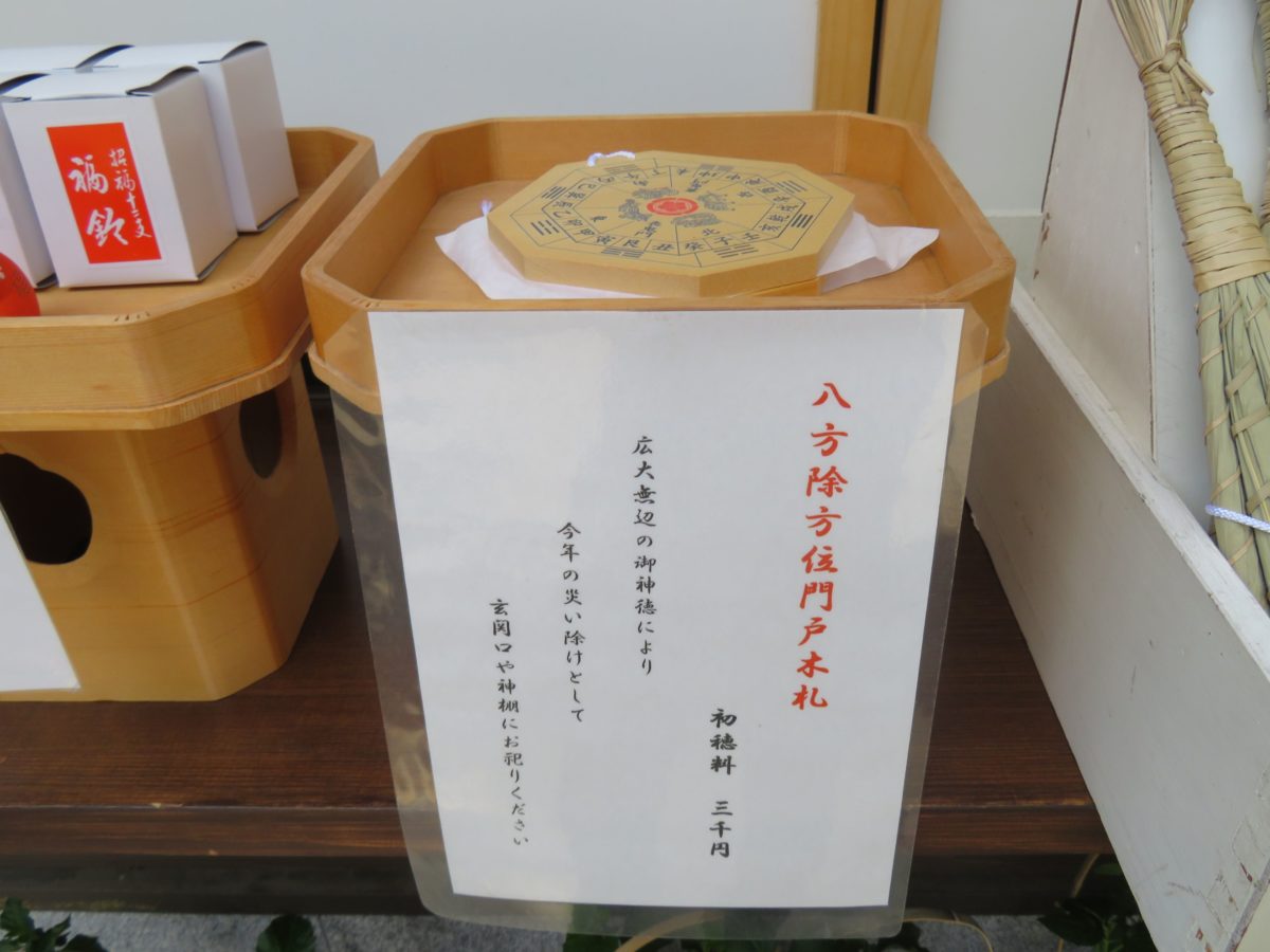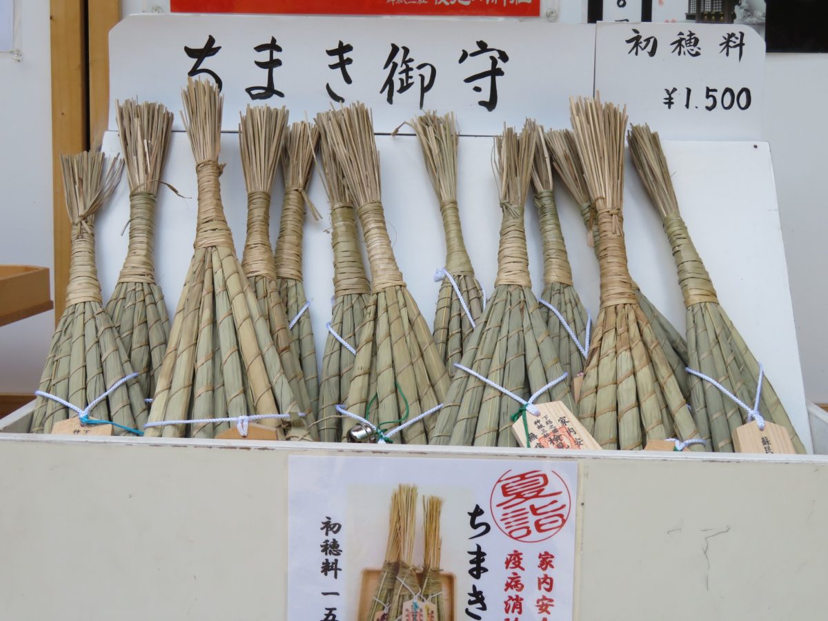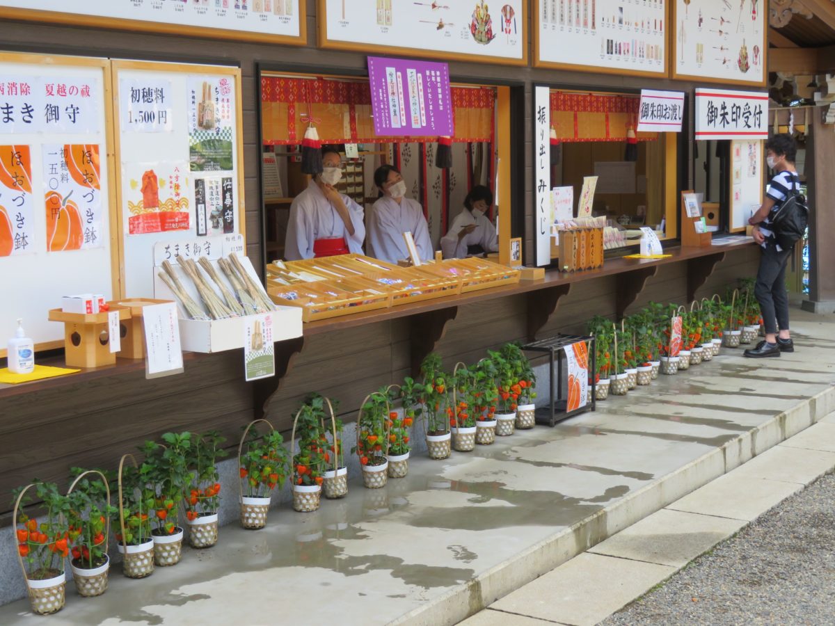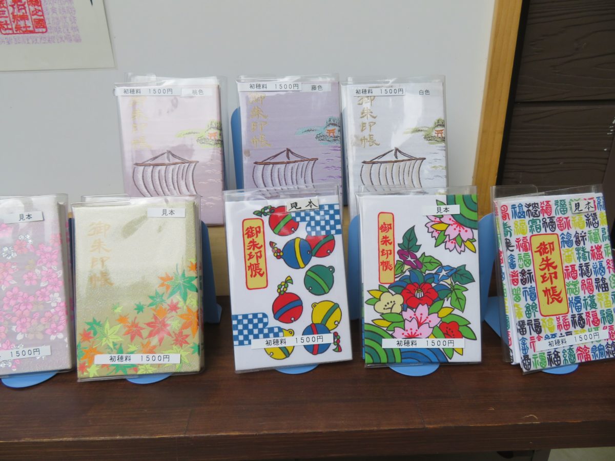 神社の授与所に並ぶ「ちまき守り」には、「蘇民将来之子孫也」と記した護符がついており、門口または玄関にかけて一年の疫病、災難除の印とします。検見川神社は八方除、鬼門除、方位除、厄除の守護神を祀っており、「八方除方位門戸木札」も販売されています。他にもカラフルな朱印帳にも目を引かれます。
