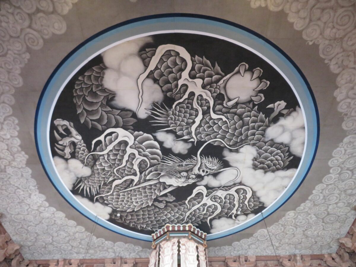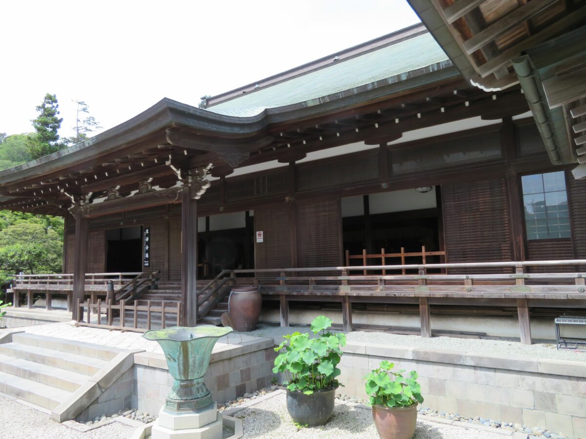 仏殿の背面には法堂が接しています。入母屋造り、方三間、裳階(もこし)付き、銅板葺きの建物は、関東最大の法堂です。天井は寺院の創建750年を記念して、小泉淳作が描いた雲龍図で装飾されます。