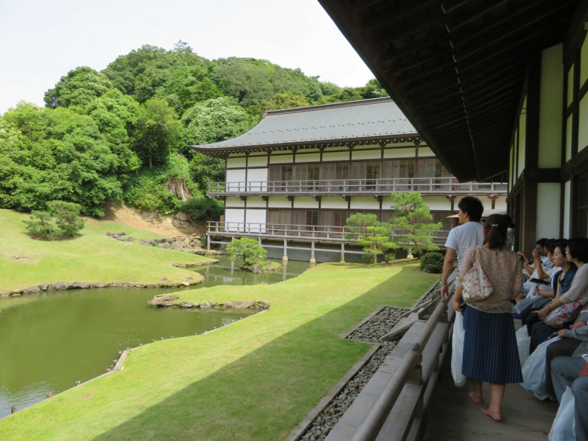法堂の奥には、法要、坐禅、研修が行われる方丈が建立されています。総門と同じく京都の般舟三昧院から、1940年に移築されました。方丈に接する日本庭園の得月楼には静かで落ち着いた雰囲気が漂います。入口の唐門の鮮やかな彩りの装飾とは対照的です。