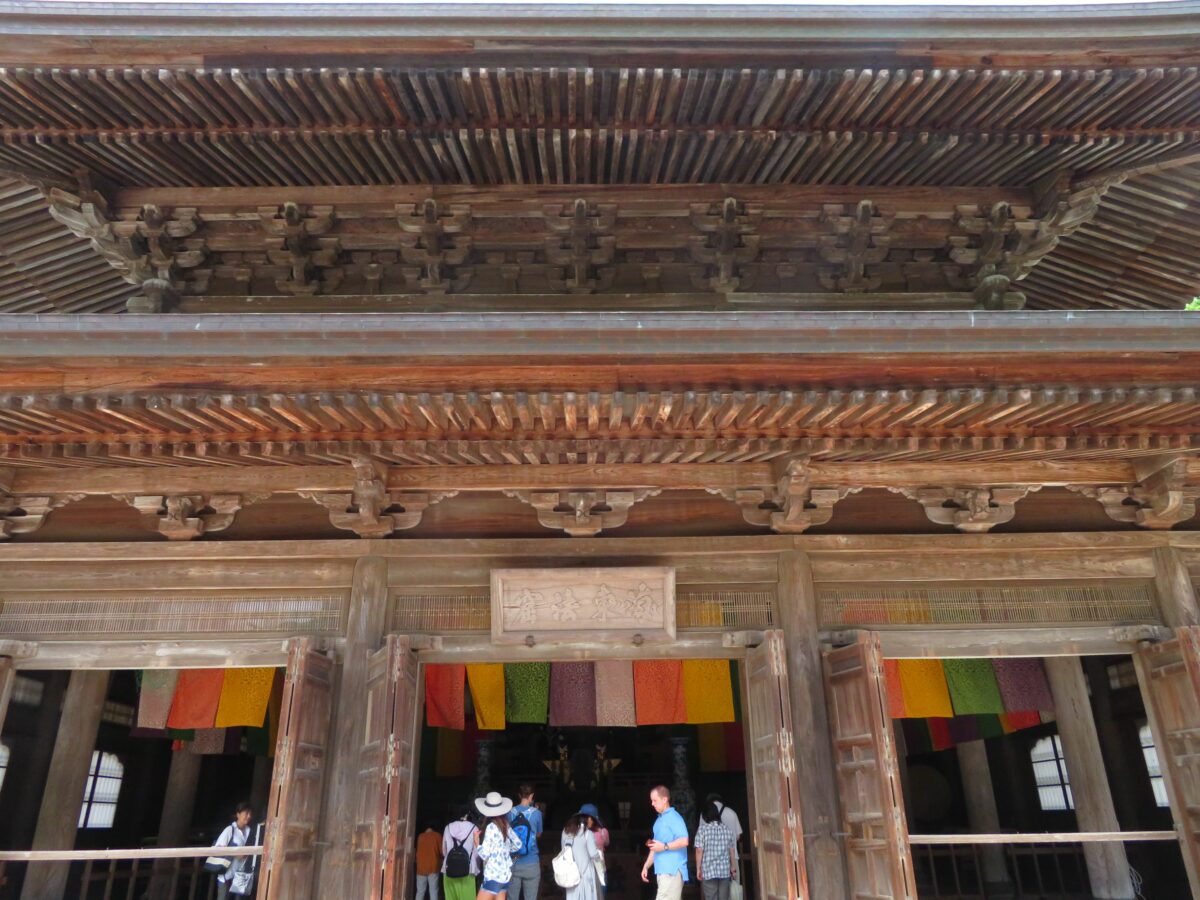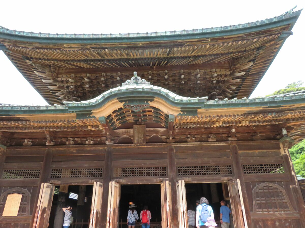 総門を潜り参道を進むと正面に、三間一戸の二重門の三門が堂々とした姿を見せてくれます。こけら葺き形銅板葺きの上層屋根で装飾される門の楼上には、釈迦如来、十六羅漢、五百羅漢が安置されています。
