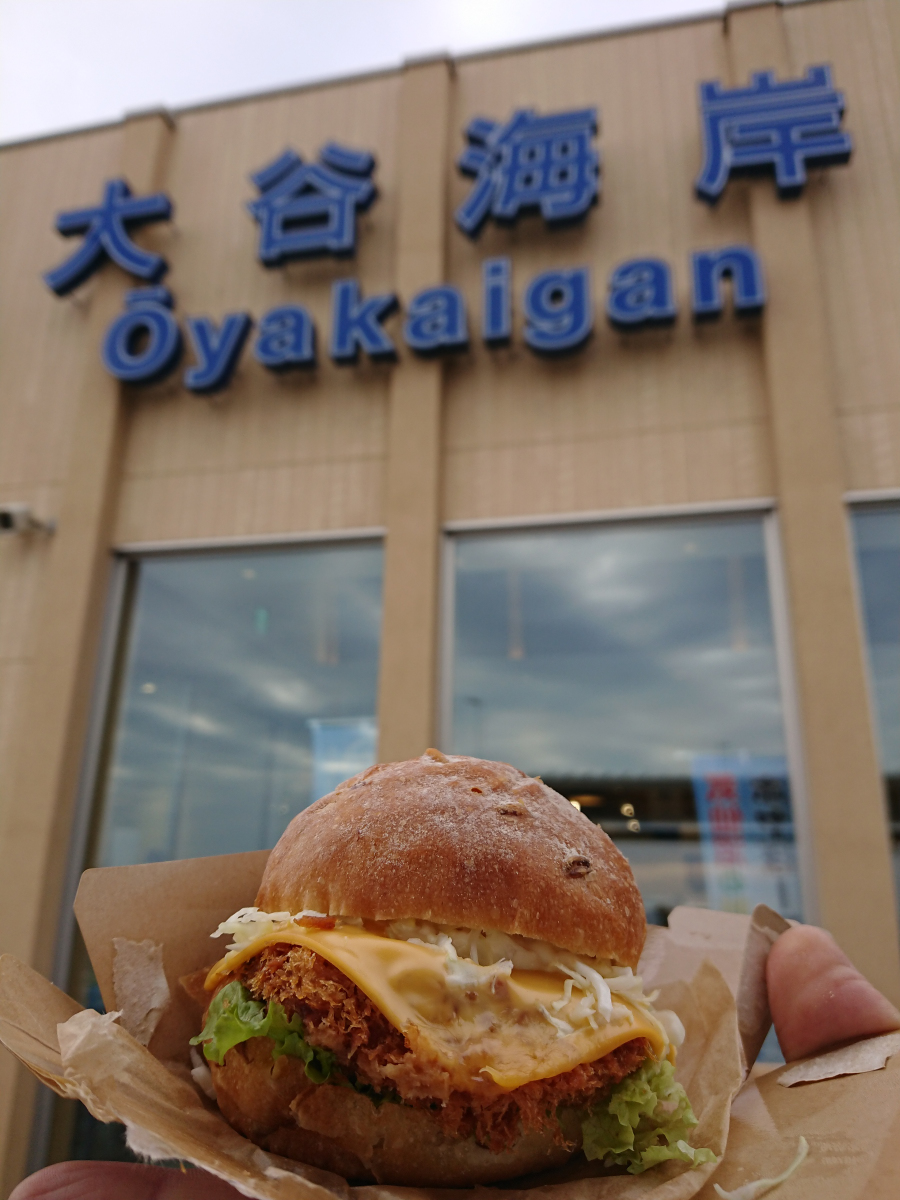 会場から南に向かい、車で20分ほどの場所に位置する道の駅 大谷海岸では、特産の鮫肉を使ったサメかつバーガーを食べられます。ツナのような風味にチキンのような触感で、チーズとの相性が良くさっぱりしていて美味しいです。余談ですが、筆者の私が住んでいる岩手内陸では鮫肉は普通に流通していますが、産地気仙沼ではあまり食べられていなかったそうです。