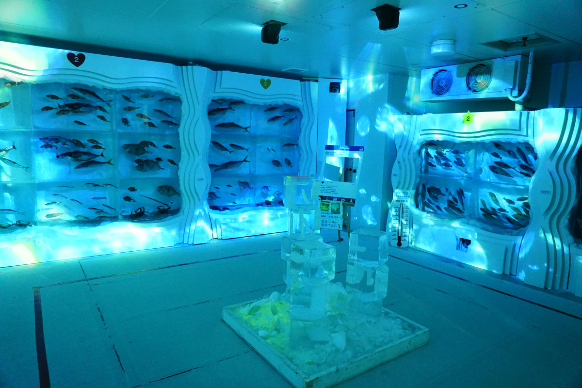 「海の市」1階には「氷の水族館」があり、気仙沼で獲れるたくさんの魚が-20℃で冷凍展示されています。三陸の海をテーマにしたプロジェクションマッピングが上映され、本当に美しいです。