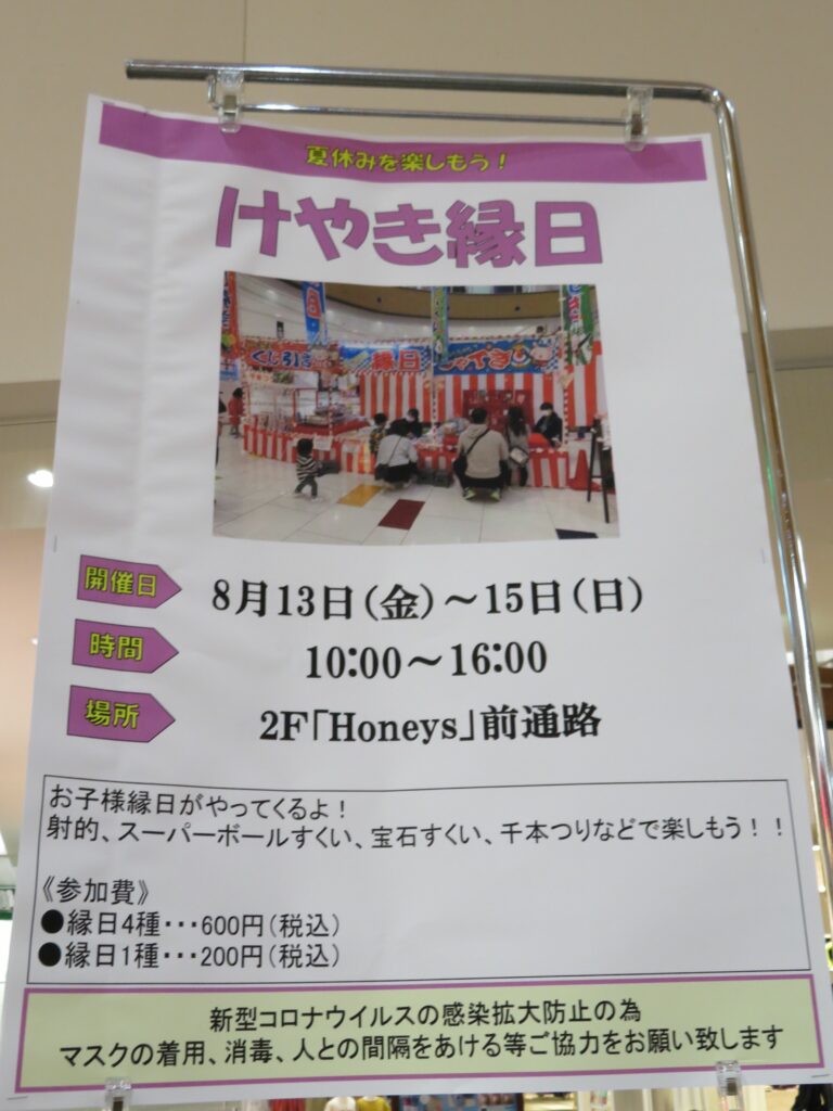 けやきウォーク前橋の「けやき縁日」の会場は、施設の2階の「Honeys」前の通路です。射的、スーパーボールすくい、宝石すくい、千本つりの露店が並び、規模は大きくはありませんがオマツリの気分を味わうことができます。